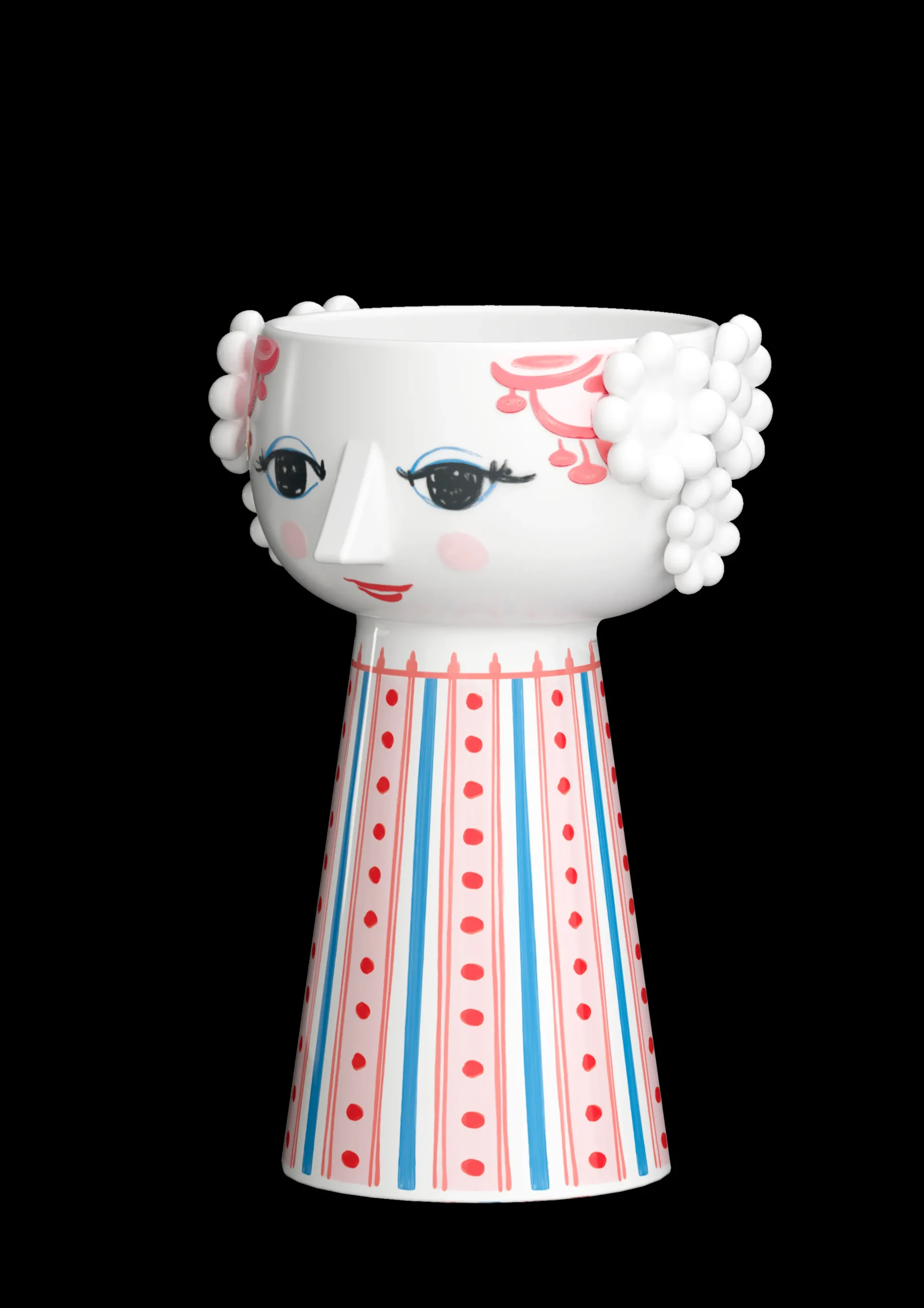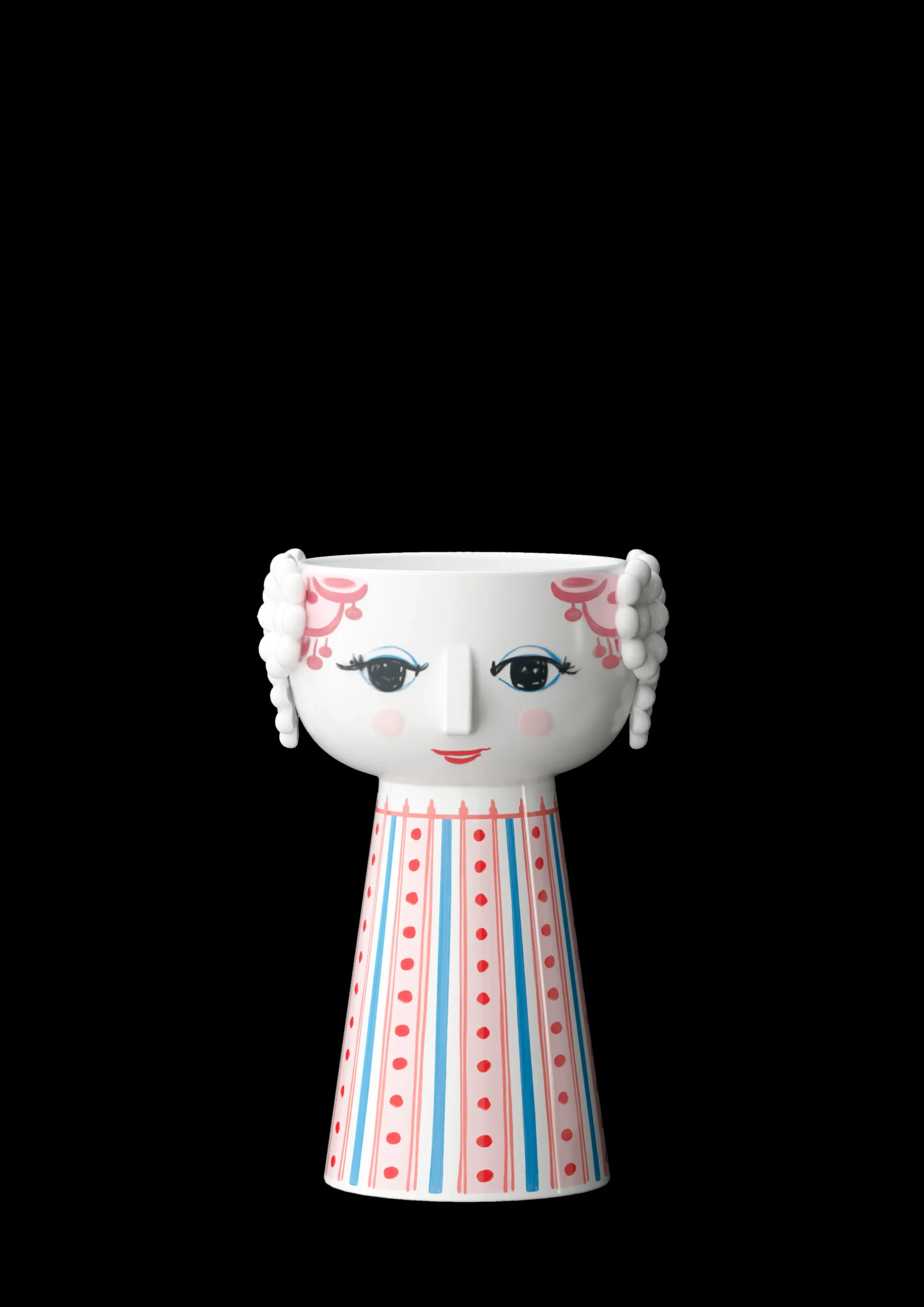 Udfold din farverige personlighed og lad kreativiteten lyse med Bjørn Wiinblads Eva. Med sit glade smil, de blussende kinder og farverige dekorationer rummer Eva på alle måder essensen af Bjørn Wiinblad som person og kunstner – også når hun tager form som lysestage. Glad og drømmende skaber hun liv og personlighed i indretningen med sit poetiske udtryk og sine sprudlende farver. Denne Eva-lysestage er 14 cm i højden og er holdt i farven støvet rød med detaljer i lyserøde, røde og blå nuancer, og når et tændt lys placeres i stagen, lyser den endnu mere op og gør hverdagen lidt mere farverig. Lysestagen er lavet af blankglaseret keramik med farvet decal og er inspireret af Bjørn Wiinblads originale Eva-univers, hvor brede hoveder med blomsterdekorationer og en kegleformet krop dannede grundstenene. Ansigtet med de mandelformede øjne og den spidse næse er Wiinblads oprindelige streg, og det farverige kjolemønster er en nyfortolkning af Bjørn Wiinblads illustrationer fra arkiverne.