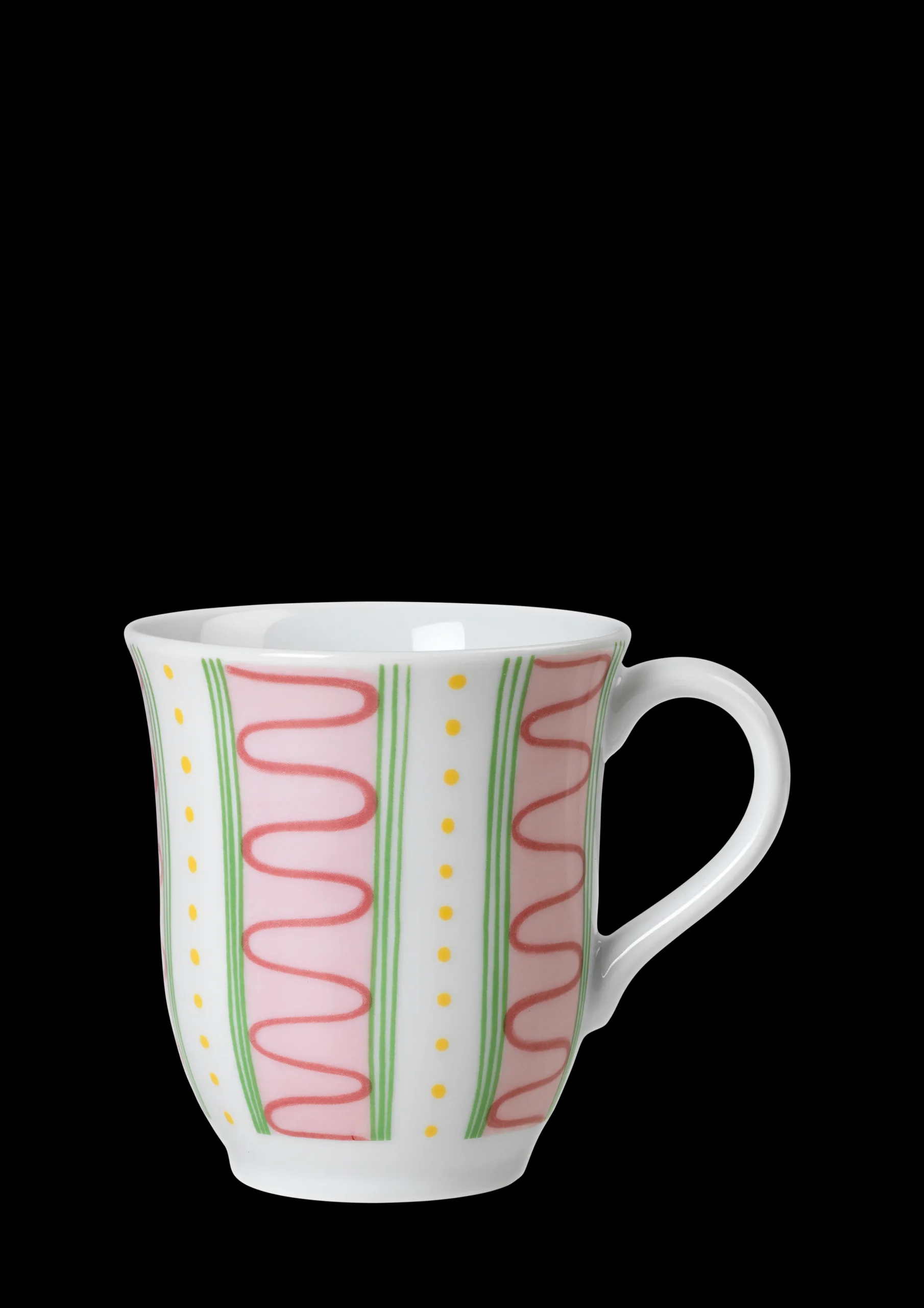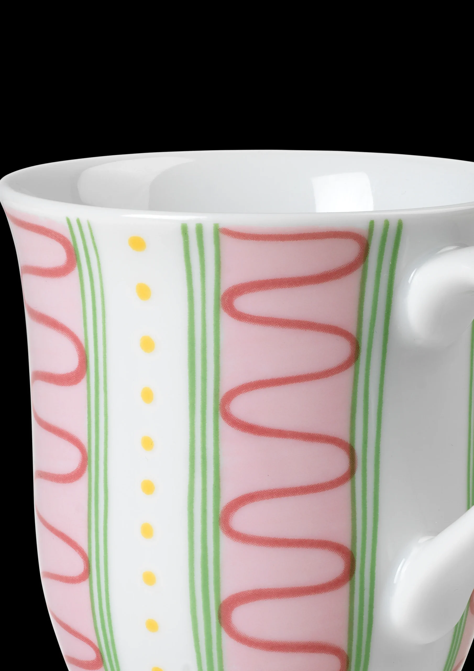 Bjørn Wiinblads univers er alt andet end minimalistisk. Det er overdådigt, skævt, vidunderligt – og i høj grad defineret af livlige farver og en unik stil. Du finder også hans mange finurlige og kunstneriske dekorationer på krus, hvor farverige, geometriske former med et håndtegnet præg blandes på kryds og tværs og alligevel fungerer forrygende sammen. Eva-kruset i rosa har snoede striber i pink hele vejen rundt indrammet af lodrette grønne striber og gule prikker. Mønsteret er inspireret af Eva-vasens forskellige kjoler, og farverne er holdt i de samme delikate nuancer, der kendetegner Evas glade og venlige univers. Kruset rummer 35 cl – perfekt til en god kop kaffe eller te. Det kan roligt vaskes i opvaskemaskinen, når der er sjovere ting i livet end at vaske op i hånden. Hver enkelt krus har sin helt egen personlighed og farvepalette, men har stadig et tydeligt familieskab i kraft af Bjørn Wiinblads genkendelige streg. Eva-kruset pynter og skaber glæde både på bordet og på hylden, hvor det lyser op og gør hverdagen lidt mere farverig – præcis som Bjørn Wiinblad elskede det.