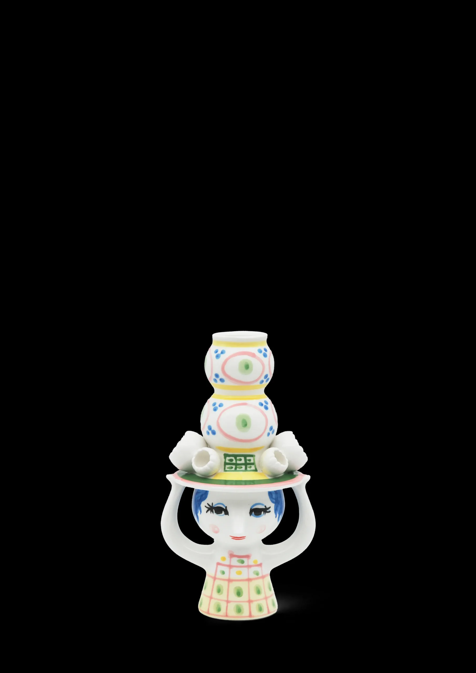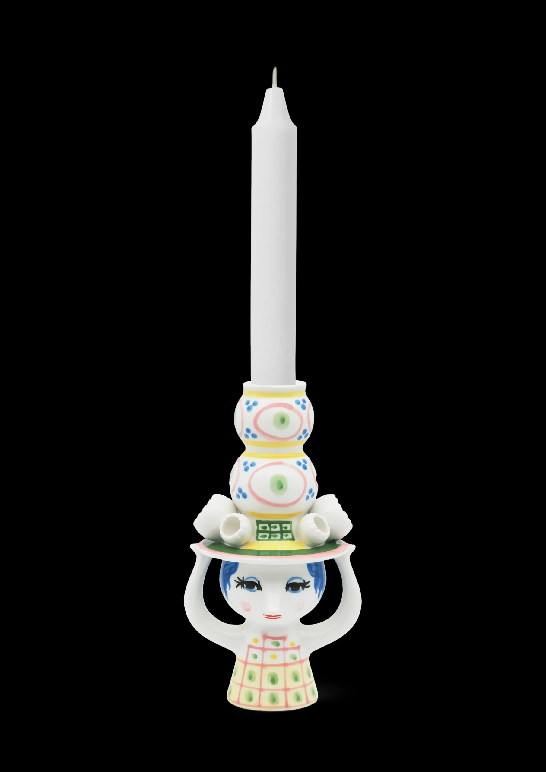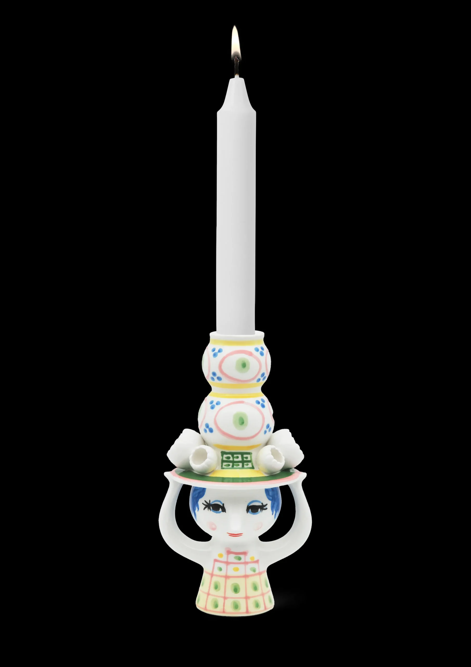 Invitér den nye hattefrøken indenfor, og lad hende skabe glæde i boligen med sine fine farver, finurlige detaljer og håndmalede dekorationer. Bjørn Wiinblad havde en forkærlighed for figurer med hatte, og arkiverne rummer utallige eksempler på, hvordan hatten dukker op igen og igen på nye, kreative og legende måder. Han designede selvfølgelig ikke små, fine pyntehatte. Nej, det var store voluminøse kreationer, der var både skulpturelle og avantgarde i deres udtryk – præcis som i serien Lady with hat. Lysestagen i blankglaseret keramik med en højde på 16 cm er overvejende lyserød i udtrykket og har detaljer i grøn, gul og blå. Som et lille tårn vokser hatten op mod himlen, mens den fine frøken balancerer hatten med sine hænder. Det giver lysestagen et finurligt og fantasifuldt udtryk perfekt i den legende boligindretning. Brug den til både hvide, farvede, lige og snoede lys – eller hvorfor ikke med en enkelt dekorativ tørret blomst? Designet inviterer dig til at være kreativ i din indretning. En anden detalje, der er gennemgående i serien, er de små, figurative blomster, der er placeret langs skyggen på hattene. Endnu en dekorativ detalje inspireret af Bjørn Wiinblads originale former og farver. Præcis som Bjørn Wiinblad repræsenterer Lady with hat alt, hvad der er skørt, skævt, kreativt og vidunderligt. Lysestagen er ikke beregnet til vand, men kan benyttes til tørrede blomster.