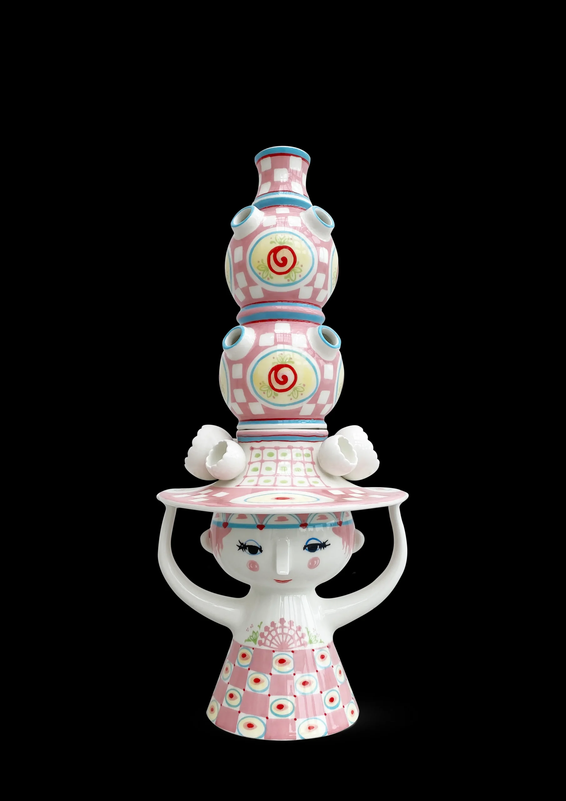 Invitér en rigtig Lady indenfor og lad hende skabe glæde i boligen med sine fine farver, finurlige detaljer og håndmalede dekorationer. Bjørn Wiinblad havde en forkærlighed for figurer med hatte, og arkiverne rummer utallige eksempler på, hvordan hatten dukker op igen og igen på nye, kreative og legende måder. Han designede selvfølgelig ikke små uanseelige pyntehatte. Nej, det var store voluminøse kreationer, der var både skulpturelle og avantgarde i deres udtryk – præcis som i serien Lady with hat. Og Bjørn Wiinblads univers bliver nok heller ikke meget mere magisk, fantasifuldt, fantastisk og overdådigt, end det er tilfældet med denne helt spektakulære vase i glaseret keramik. Den omfavner til fulde alt, hvad der er skørt, skævt, kreativt og vidunderligt i Bjørn Wiinblads verden. Vasen måler intet mindre end 50 cm i højden og er hånddekoreret fra top til tå med motiver inspireret af Bjørn Wiinblads mangfoldige arkiv. Og det er ikke bare én vase. Vasen består af to individuelle vaser, der både fungerer sammen og kan stå alene. Vasens base prydes af det ikoniske ansigt med den trekantede næse, de mandelformede øjne, rosenrøde kinder og det finurlige smil på læben. Med sine skulpturelle arme holder den håndmalede hattefrøken den store hat, der er udsmykket med yndige tulipaner formet i keramik på hver side. Kjolen er fuldt dekoreret med cirkler og striber i en frisk og dristig pink nuance, der er smukt afbalanceret i lysegule, lyseblå, grønne og røde toner – farver der bringer positivitet, varme og bidrager med masser af lysstyrke. Og går du lidt tættere på, vil du også finde de sødeste håndmalede roser og ternede mønstre med små åbninger i siderne, som dine yndlingsblomster kan falde yndefuldt ned i. I bunden af begge vasens dele ses den originale Bjørn Wiinblad-signatur og en tekst, der dokumenterer, at vasen er håndmalet – et bevis på at du er sikret dit helt eget unikke håndmalede designikon. Brug vasen til at give dine gæster en overdådig velkomst i entreen eller som et statement på skænken, i vindueskarmen eller på bordet.