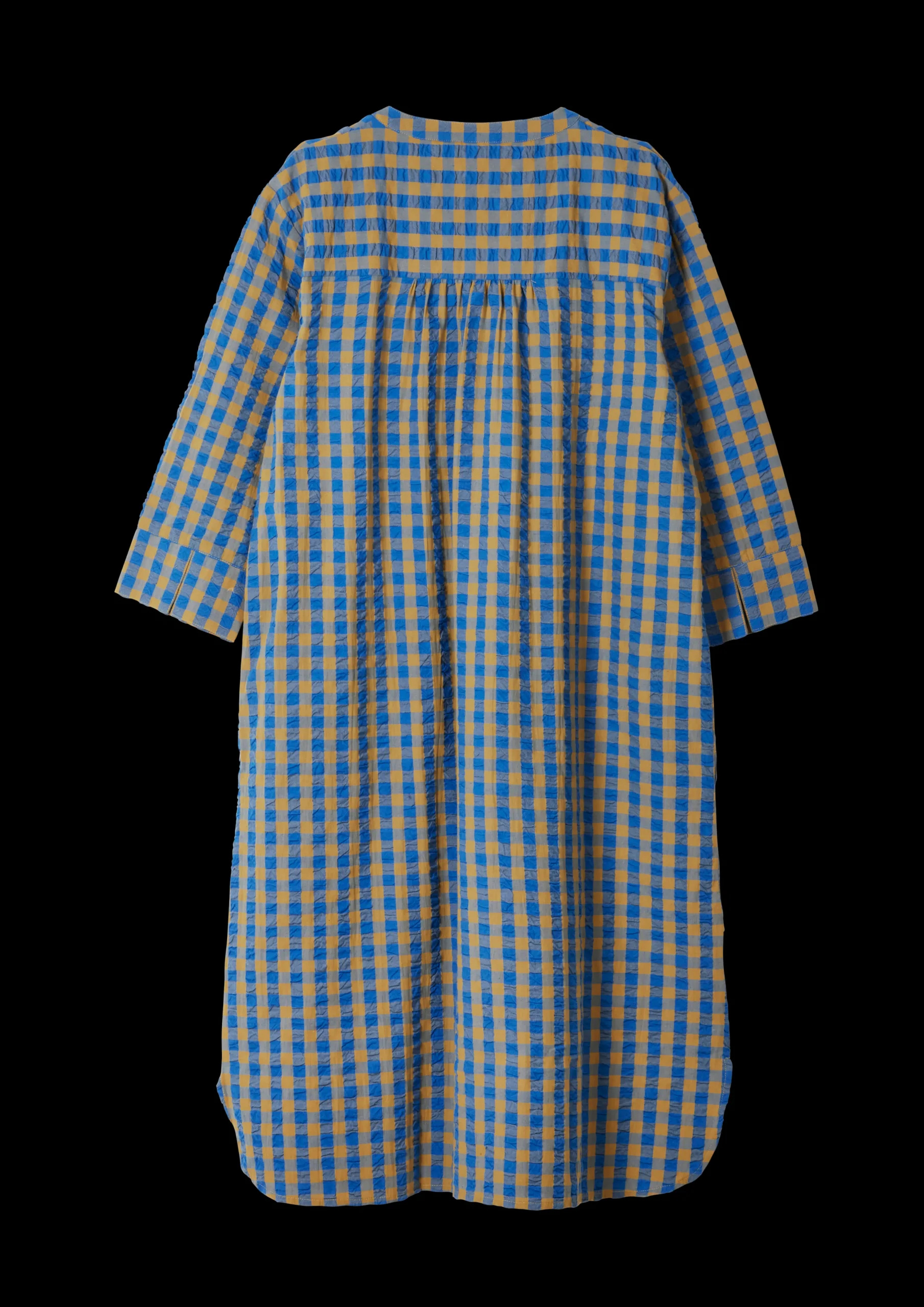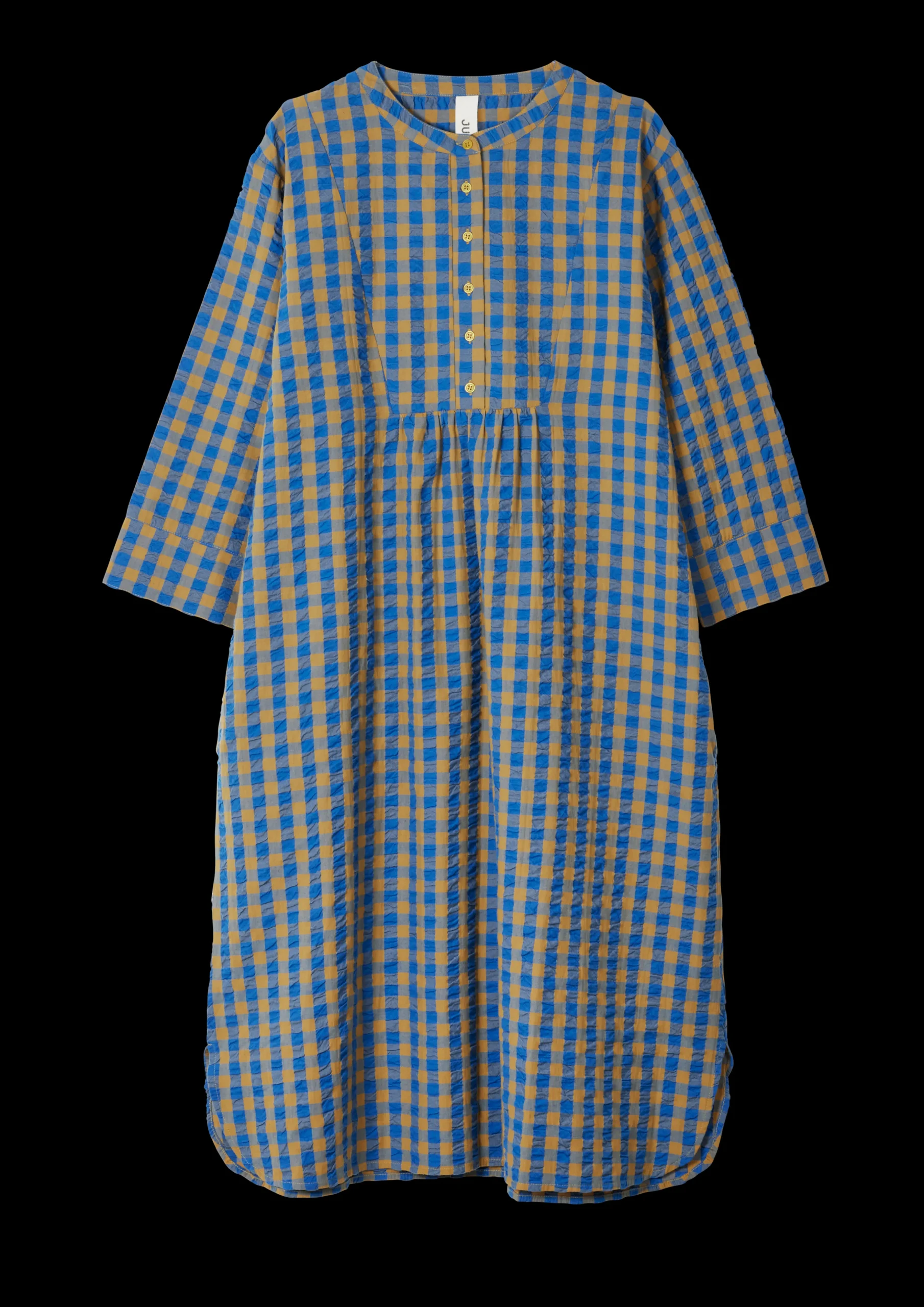 JUNA Garderobe er fyldt med tidens moderigtige outfits fremstillet af de samme økologiske tekstiler, der bliver brugt til JUNAs populære sengetøj, og kan bruges som nattøj, sommertøj og som en del af en casual indendørsgarderobe. Kjolen i modellen Sonja i ternet Bæku0026Bølge i blå/okker har en løs pasform og et behageligt snit, der gør den oplagt til mange formål. Den har knaplukning, indvendige lommer i siderne, og de halvlange ærmer giver kjolen et let og elegant udtryk – perfekt til både en lang vinterweekend derhjemme eller til sommerens strandture. Sonja-kjolen i Bæku0026Bølge blå/okker er fremstillet i 100% økologisk bomuld, der er GOTS-certificeret og produceres i overensstemmelse med EU-standarder. Den tåler maskinvask op til 40 grader, hvilket ikke blot er skånsomt for miljøet, men også for tøjet, der får længere levetid ved den lavere temperatur. Bemærk at kjolen er stor i størrelsen.