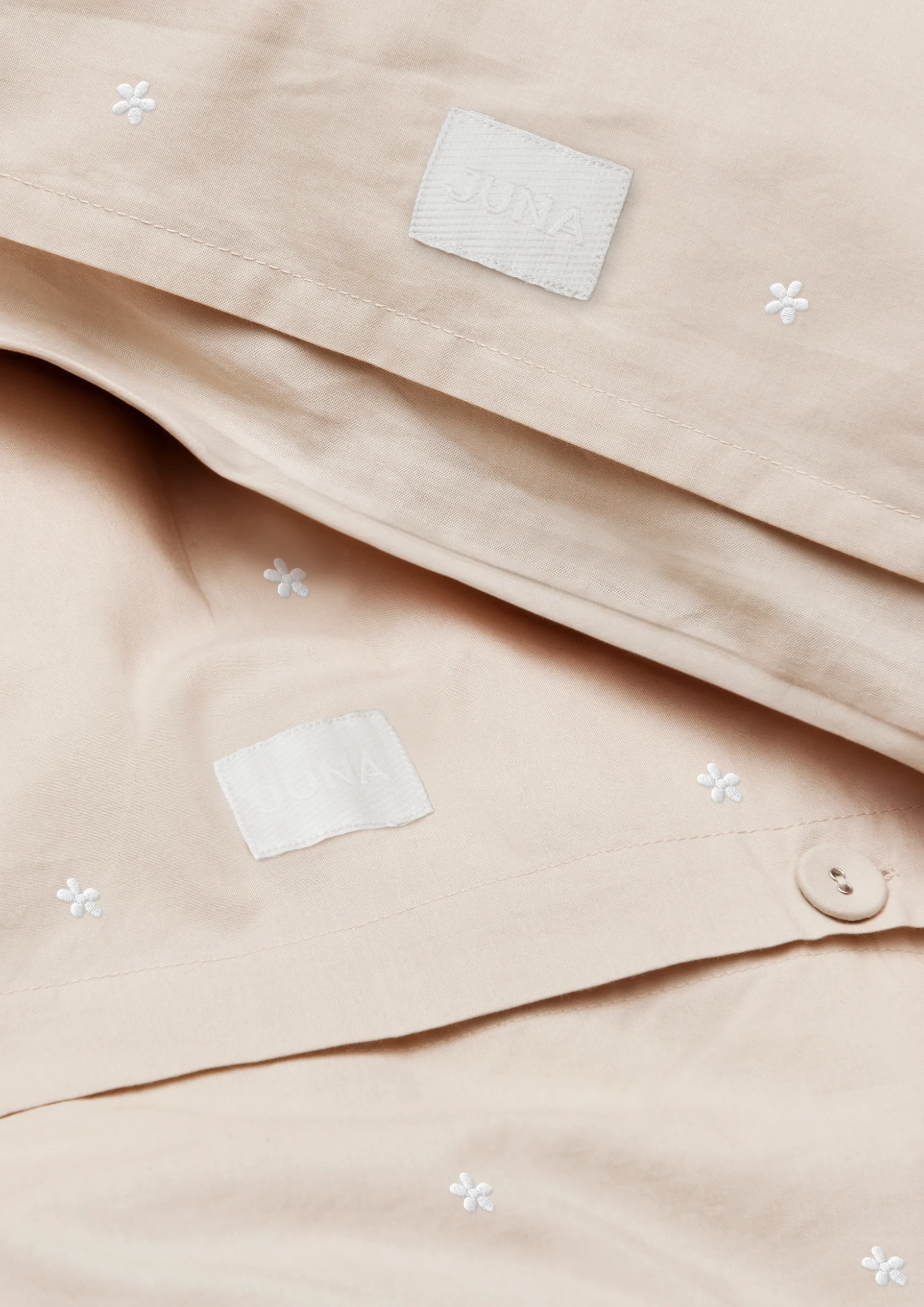 Små blomster til store drømme. Med Daisy-sengesættet fra JUNA får du en nyfortolkning af det klassiske blomsterprint, hvor en broderet blomst i kontrastfarve smukt og stilfuldt spiller sammen med JUNAs altid både enkle og moderne design. Sanseligt, behageligt og produceret ud fra ansvarlige principper. Sådan kender du sengetøjet fra JUNA. Og med Daisy-serien fortsætter JUNA i samme både vidunderlige og ansvarlige stil, hvor uendelige drømme lever og ånder side om side med en passioneret vision for ansvarlighed og cirkularitet nu og i fremtiden. Sengetøjet til almindelige dyner måler 140×200 cm, og i denne smukke sandfarvede version med små broderede blomster i hvid får du en farvesammensætning med masser af hygge og varme, men som fortsat er helt klassisk. Daisy er fremstillet i 100% økologisk bomuld, der både er GOTS-certificeret og OEKO-TEX®-mærket, så du kan nyde en god nats søvn med god samvittighed. Og når du kommer helt tæt på Daisy-sengetøjet, vil du ud over detaljerne med de mange små margueritter også virkelig kunne se og mærke lækkerheden i den tætte og fine bomuldspercale, der giver stoffet en blød og glat tekstur. Samtidig med at være ekstrem behagelig at sove i får du med percalevævningen også et meget slidstærkt og holdbart sengesæt i en eksklusiv kvalitet, som du kan have glæde af nat efter nat – og år efter år. Daisy-seriens hyggelige og klassiske vibe med et moderne tvist skaber en glad og drømmende stemning i soveværelset, i sofaen, i hængekøjen, på altanen, eller hvor du nu tager din dyne og pude med hen. Det er helt op til dig, og med de forskellige Daisy-sengesæt fra JUNA kan du jo sagtens mixe og matche farver på dyner og puder på kryds og tværs og skabe din helt egen stil. (GOTS ”Organic” Certified by Control Union, CU1026087)