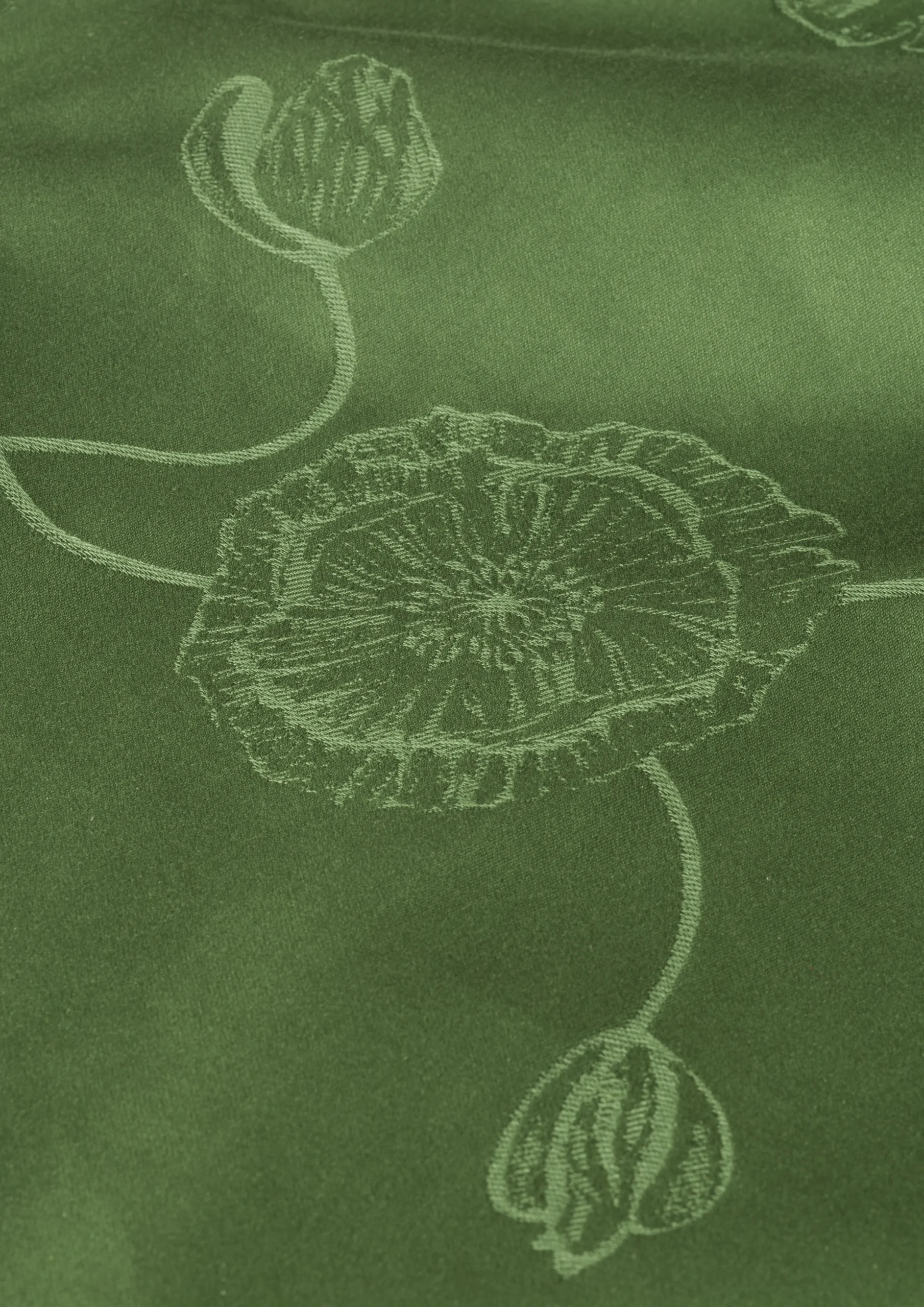 Med Hammershøi Poppy-damaskdugen i afdæmpet olivengrøn vokser valmueblomsten fra Kählers populære Hammershøi Poppy-stel ind i tekstiluniverset som vævet valmuemotiv og giver dig en flot mørk bund til både det klassiske hvide Hammershøi-stel og selvfølgelig Poppy-stellet. Poppy-serien er kendetegnet ved en poetisk og moderne fortolkning af naturens eget kunstværk, og med den grønne Hammershøi Poppy-damaskdug breder du i en tidløs elegance smukt den florale æstetik ud over hele bordet, hvor naturens egen grønne farve vil skabe en varm og velkendt tryghed og på fornemmeste vis forbinde Hammershøi Poppy-serien til naturen udenfor. Dugen måler 150×370 cm og kommer i 100% økologisk bomuld, der også er OEKO-TEX®-mærket. Valmuen er kendt for sine kreppede blomsterblade og feminine farvenuancer og falder dermed perfekt sammen med damasktraditionen, der med blanke og matte tråde løfter blomstermotivet og lader det træde frem som strukturmønster på dugen. Hammershøi Poppy-damaskdugen gør din borddækning smuk og personlig og vil danne rammen for mange hyggelige timer omkring bordet året rundt.