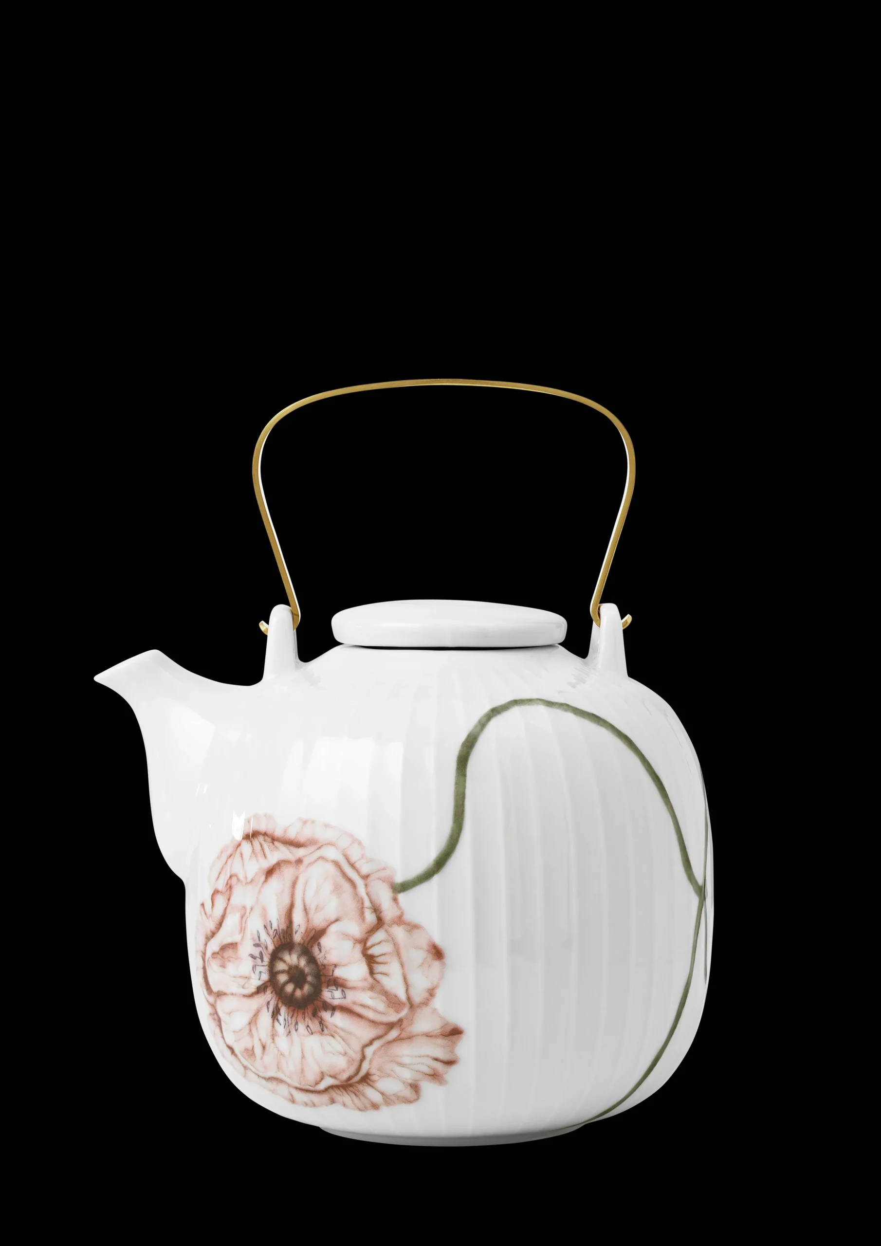 Hammershøi Poppy er en videreudvikling af den populære serie Hammershøi. Serien er designet af Hans-Christian Bauer og Rikke Jacobsen dekorerer med smuk almue akvareldekoration på det hvide porcelæn. Hammershøi Poppy er en poetisk fortolkning af valmuen i douce akvarel på klassisk hvidt Hammershøi porcelæn. Den rummelige tekande med messinghank, favner valmuens livscyklus med motiv af blomsten i fuldt flor på forsiden, og i knop på modsatte side af kanden. Poppy tekanden giver te-ritualet en opblomstring, når det serveres med stellets signaturmotiv af fine stængler og valmuer i variation. Med Poppy tekande får vi endnu flere muligheder for at sætte valmuernes poesi i spil og forny borddækningens kunst – både når hele bordet dækkes med Poppy, og når tekanden bruges i kombination med det klassiske, hvide Hammershøi-stel.