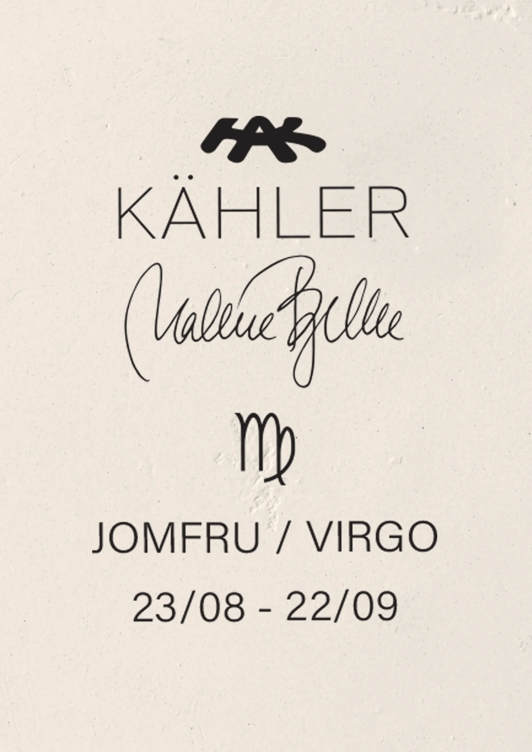 Med de nye Astro-skulpturer fra Kähler har den danske billedhugger Malene Bjelke været inspireret af Kählers mangeårige figurhistorie og skabt 12 forskellige stjernetegnsskulpturer, der på smukkeste vis fører designarven fra Kählers historiske keramikværksted op i vores moderne tid med spirituelt fokus. Alle stjernetegnsfigurer er fremstillet i hvid uglaceret stentøj og står i et skitseret look. Det rå udtryk er medvirkende til at skabe dynamik i figurerne som naturalistiske enkeltheder, så de fremstår som skulpturer, der kan opleves fra alle sider. Hver enkelt Astro-skulptur er skabt med et beskrivende ord ud fra de værdier, der knytter sig til hvert af de 12 forskellige stjernetegn, og energien fra stjernetegnenes særlige egenskaber er blevet omsat i formgivningen af figurerne. For Astro Jomfru-skulpturen er det ordet Perfektion, der kommer til udtryk i figurens positur og er med til at beskrive dette stjernetegns unikke karaktertræk. Vi anbefaler at sætte filtpuder under dine produkter for at undgå ridser. Især hvis de stilles på en sart overflade.