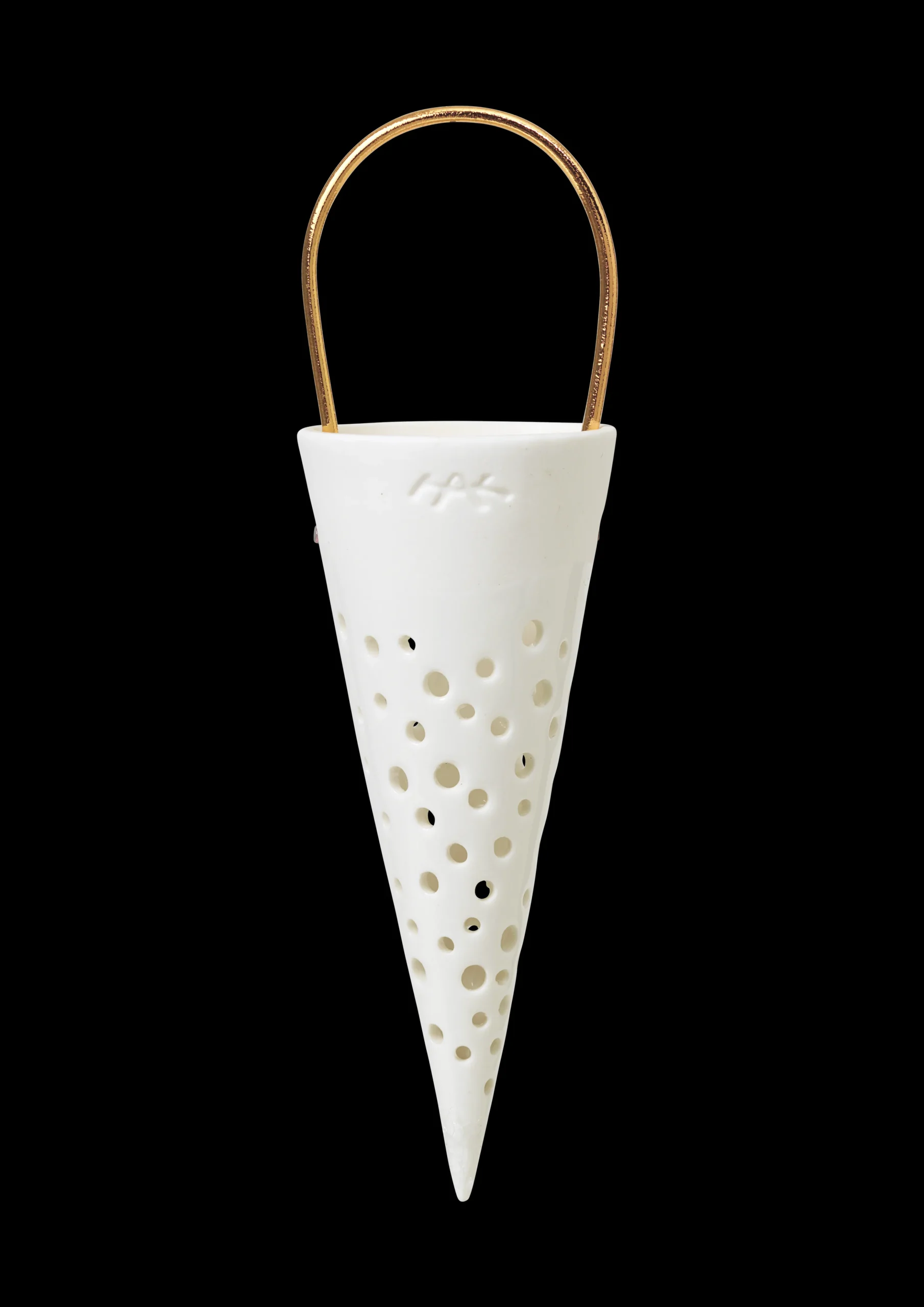 Den smukke Nobili juleserie er som skabt til at få julestemningen ind i stuerne på en moderne, diskret måde. I år tilføres serien to størrelser kræmmerhuse i snehvid og olivengrøn, i henholdsvis H14,5 cm og H18cm. Kræmmerhusene er fremstillet i benporcelæn med blank olivengrøn eller snehvid glasur m. blank guld metalbøjle og passer perfekt som pynt i alle julehjem. Kræmmerhusene er en videreførsel af Nobili juletræer, og har de mange håndskåret små dekorative huller. Kræmmerhusene er udelukkende til ophæng og dekoration. Kræmmerhus hører til på juletræet, og traditionelt skal det fyldes med godter, f.eks. pebernødder eller bolsjer. Kræmmerhuset hører til blandt de ældre former for juletræspynt, og hænger naturligvis sammen med tanken om at pynte træet med spiselige genstande. Designet af designduoen R7B – Mette Bache og Barbara Bendix Becker