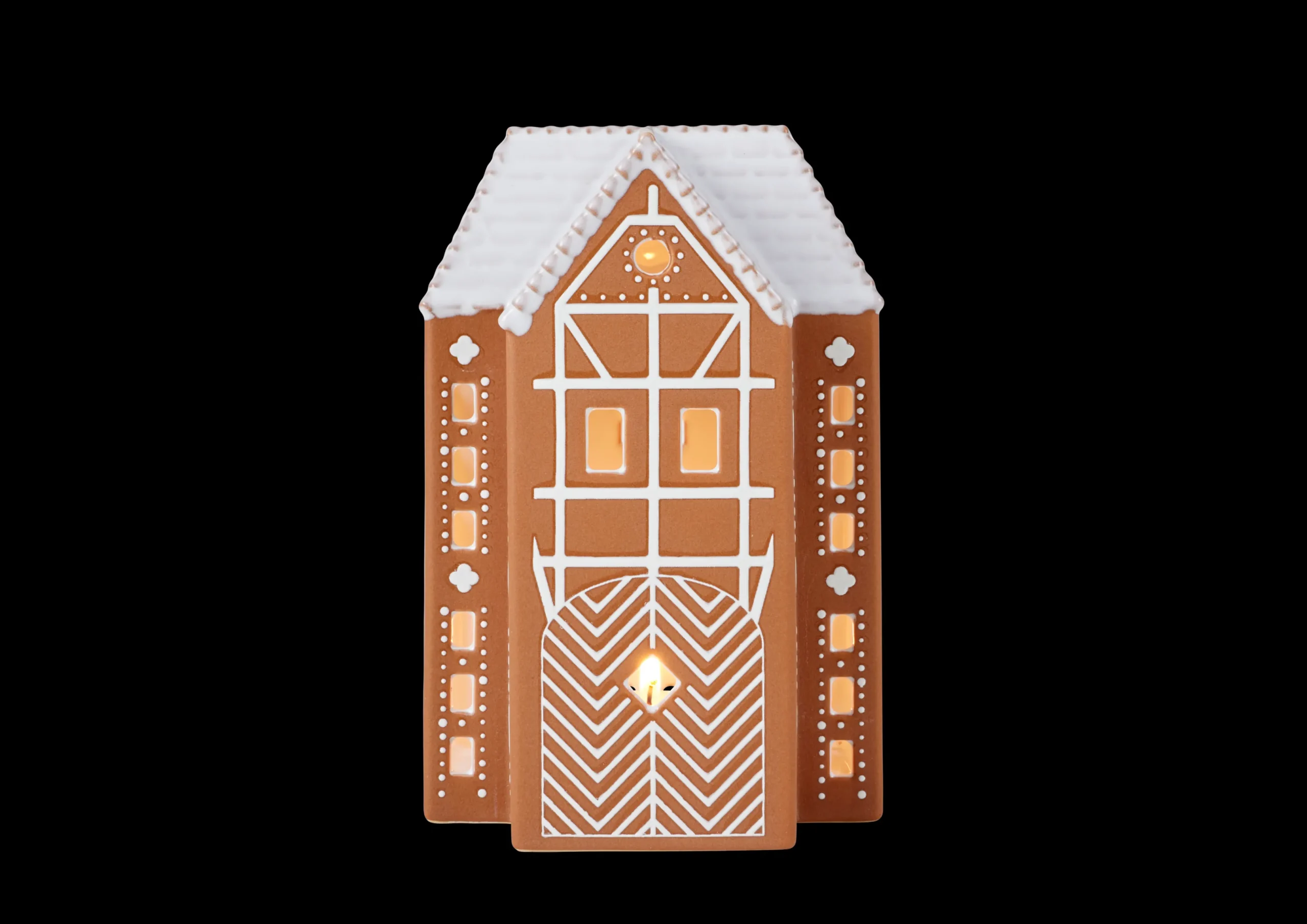 Kähler Gingerbread er en serie af håndlavede honningkagehuse, hvor Kählers keramiske ophav og den danske jul er sat på en fælles designformel. Dette honningkagehus emmer af jul, charme og traditioner og er med sine 17 cm i højden det største af honningkagehusene. Husets forside er belagt med et fint bindingsværkmønster, et cirkelformet og smukt dekoreret vindue og en stor port, der inviterer indenfor til masser af autentisk varme og hygge. Siderne på lyshuset er pyntet med store, hvide hjerter som symbol på den kærlighed, der ligger i hjerternes fest – julen. Skab et hyggeligt julelandskab med nisser omkring husene eller brug dem alene som håndlavede designelementer, der med deres blanke og taktile glasur og den rå, uglaserede keramik vil stå smukt og sprede hygge. Gingerbread-lyshusene har en brun, mat yderside, der minder om honningkagedejen og er pyntet med hvide, blanke dekorationer og hvide tage, der ligner glasur. Og som en vigtig detalje er honningkagehusene hvidglaseret indvendigt, så det varme lys fra fyrfadslyset reflekteres og skinner ud. Store som små er de alle udskåret i hånden, og lyset fra husene skaber på denne måde legende klynger af lys og skygge omkring sig, hvor end honningkagehusene placeres.