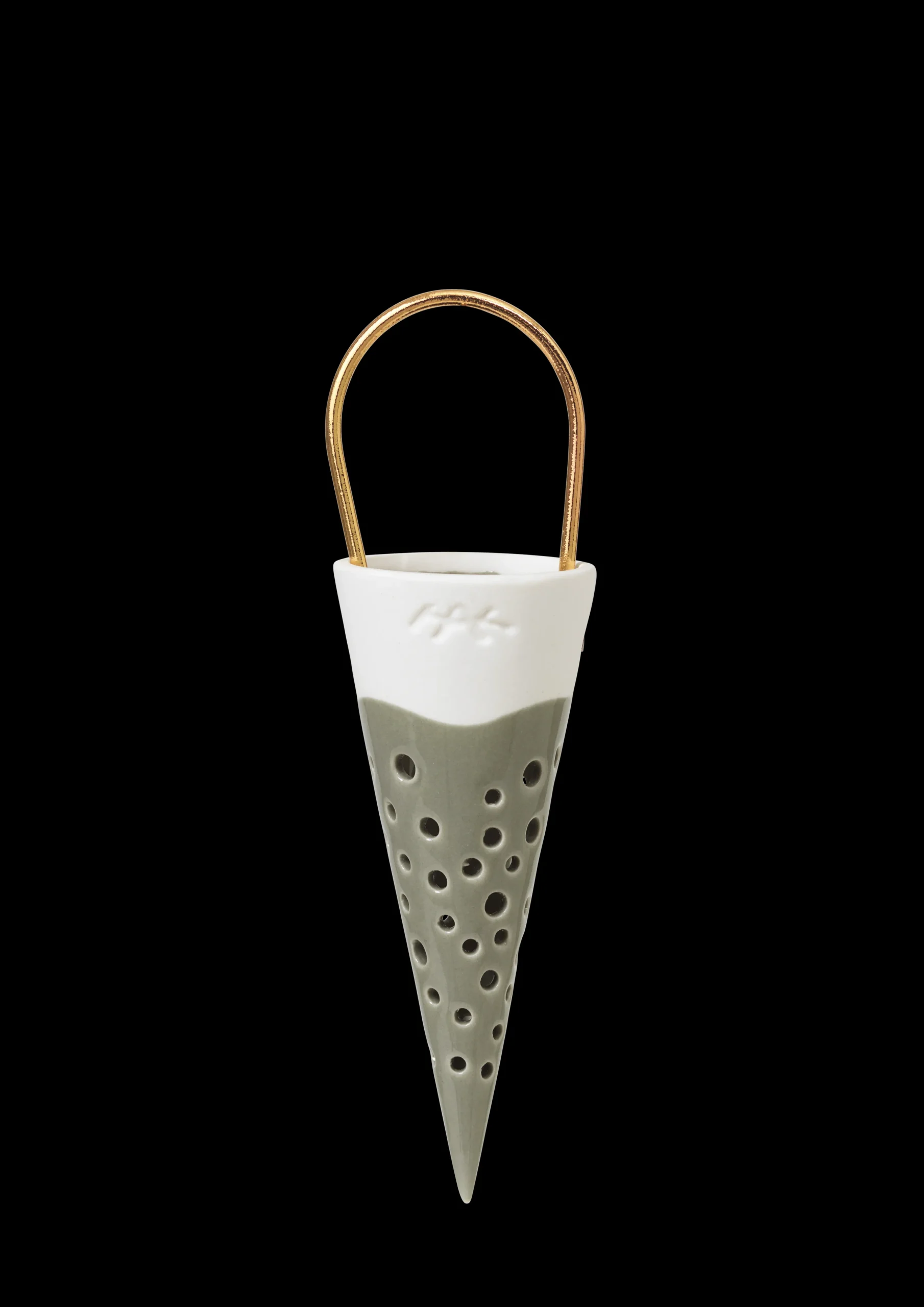 Den smukke Nobili juleserie er som skabt til at få julestemningen ind i stuerne på en moderne, diskret måde. I år tilføres serien to størrelser kræmmerhuse i snehvid og olivengrøn, i henholdsvis H14,5 cm og H18cm. Kræmmerhusene er fremstillet i benporcelæn med blank olivengrøn eller snehvid glasur m. blank guld metalbøjle og passer perfekt som pynt i alle julehjem. Kræmmerhusene er en videreførsel af Nobili juletræer, og har de mange håndskåret små dekorative huller. Kræmmerhusene er udelukkende til ophæng og dekoration. Kræmmerhus hører til på juletræet, og traditionelt skal det fyldes med godter, f.eks. pebernødder eller bolsjer. Kræmmerhuset hører til blandt de ældre former for juletræspynt, og hænger naturligvis sammen med tanken om at pynte træet med spiselige genstande. Designet af designduoen R7B – Mette Bache og Barbara Bendix Becker