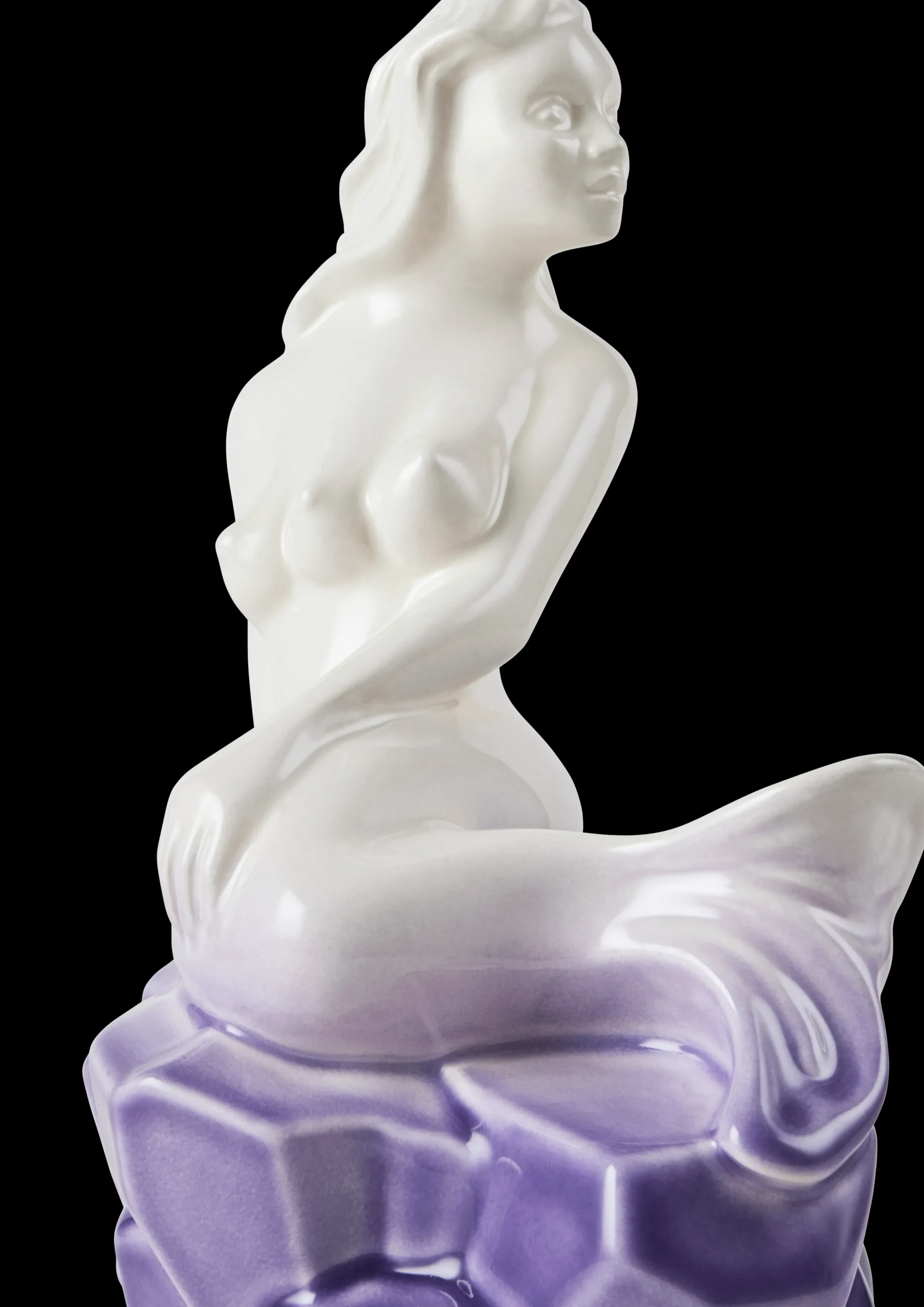 Improved and impatient. Forbedret og utålmodig. Med udgangspunkt i H.C. Andersens verdensberømte eventyr om Den Lille Havfrue har kunstner Louise Hindsgavl med sin vanlige pirrende og provokerende keramiske kunst endnu engang i samarbejde med Kähler skabt en figurativ kickstarter til livets ofte lidt svære snakke. The Ambitious hedder hendes nye figurer i glaseret keramik. Her fortæller hun historien om en havfrue, der prøver nye veje for at gøre sine drømme til virkelighed. Som den foretagsomme og initiativrige unge kvinde hun er, har hun forsøgt sig med ben i stedet for hale. Og hun er klar til at tage et skridt videre. Måske skal der et ekstra bryst til for at charmere prinsen? Den utålmodighed, som havfruen efterhånden må føle i sine bestræbelser på at få prinsen i nettet, har Louise Hindsgavl i sin fænomenale formgivning subtilt udtrykt med den svirpende bevægelse i halen. The Ambitious-figurerne er 20 cm høje og fås i grå, blå og denne lilla variant. Alle emmer af Kählers autenticitet og håndlavede designtraditioner, samtidig med at de med deres udfordrende udtryksform lægger op til samtalen om det, Louise Hindsgavl kalder ’de ting, vi skylder hinanden at tale om, men ofte ikke selv tør tage hul på’. Med The Ambitious tager hun os med ind i en utålmodighedens og mulighedernes verden og stiller sit figurative arbejde til skue – og debat. Hun påtager sig som kunstner ansvaret, påtager sig risikoen ved at starte den svære samtale. For ud over at skabe moderne kunst og design til boligen, så vil Louise Hindsgavl med The Ambitious-figurerne gerne kradse i overfladen på vores kultur og skabe platformen for en diskussion. For eksempel om hvad der ligger i vores stræbsomhed, og hvor langt vi vil gå for at indfri vores ambitioner. The Ambitious bliver kun solgt på Holmegaard værket og på Rosendahl.com. Der bliver kun produceret 200 stk. af hver farve, og de er alle nummererede. Vi kan ikke oplyse om hvilket nummer din figur har/får.