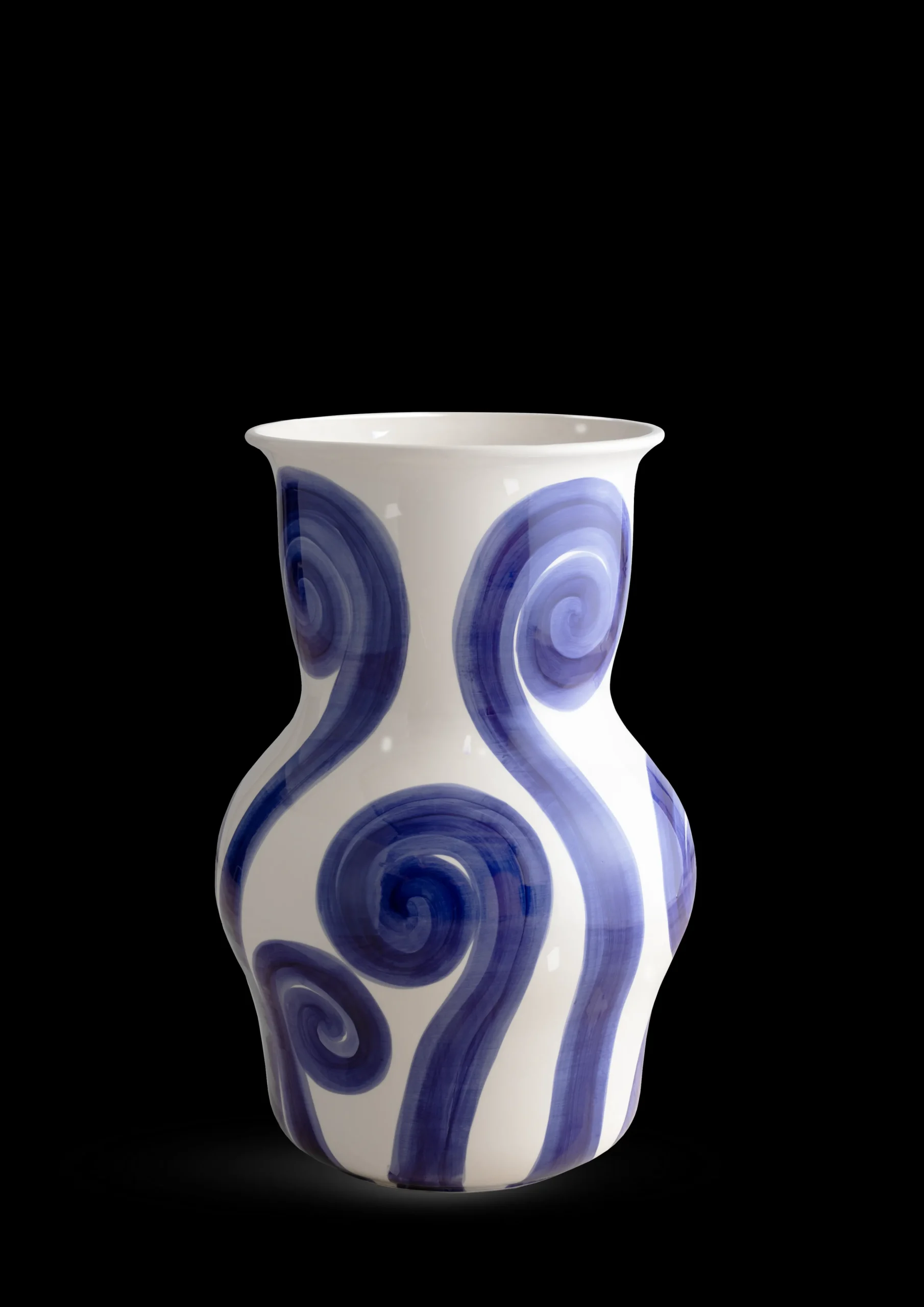 Med vaseserien Tulle fejrer Kähler nostalgien med former og farver og håndmalede dekorationer inspireret af de ældre Kähler-vaser. Og seriens store gulvvase, der kommer i begrænset oplag, er bestemt ingen undtagelse. Vasen er et ægte ’arkivprodukt’ med et moderne touch. Formen stammer fra en original Kähler-vase fra 1920’erne, mens Kähler med dekorationen hylder de mange dygtige malerdamer i det gamle Kähler-værksted. En af dem hed Tulle Emborg, der nu har fået æren af at lægge navn til Tulle-serien. Gulvvasen måler hele 60 cm i højden og er på en cremehvid bundfarve hånddekoreret med de helt særlige blå snørkler, som Tulle Emborg var en mester i at lave. Penselstrøgene er tydelige, organiske og naturlige og er med til at give vasen et meget unikt udtryk. Du kan både se og føle, at der er et menneske bag, der har gjort sig umage med at male vasen i hånden for at skabe et ekspressivt og levende udtryk. I dekorationerne fornemmer du også tydeligt den kunstneriske forståelse og de intuitive bevægelser, der gør Tulle-vasen til et anseeligt kunstværk i sig selv og tilfører den en helt særlig nostalgisk autenticitet. De runde former skaber en skulpturel og grafisk silhuet, og gulvvasens enorme størrelse betyder, at det nærmest er en selvfølge, at den står alene uden blomster som en del af en moderne indretning, der hylder historien.