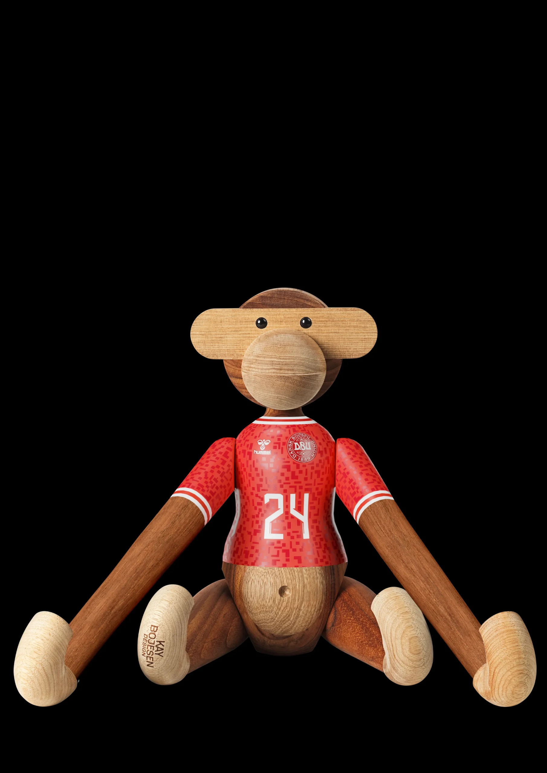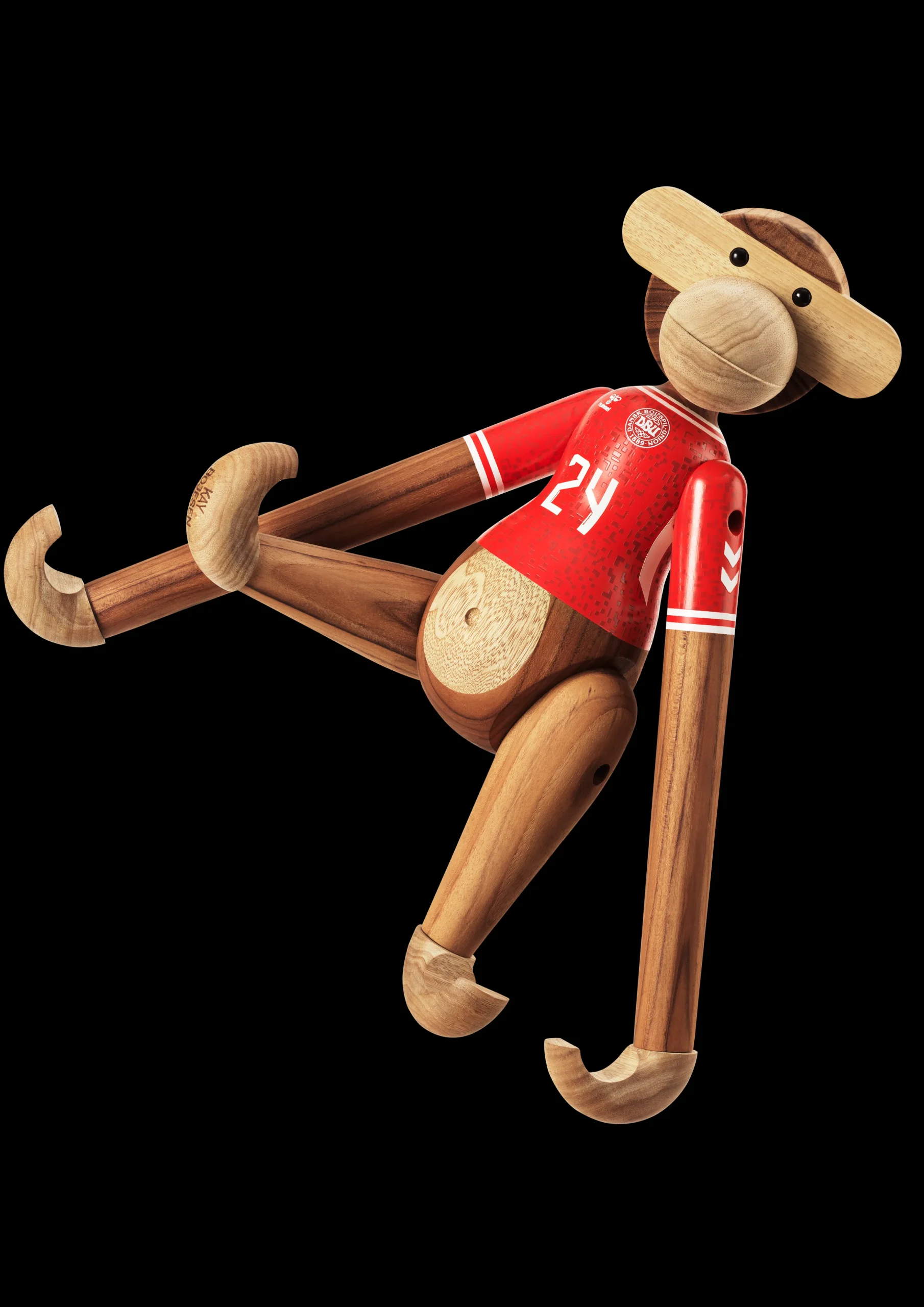 Ny holdkammerat til alle i rødt og hvidt. Med Kay Bojesen Abe x DBU er to af de største danske nationalikoner gået sammen for med humor, kreativitet og det gode håndværk at hylde sammenholdet og stoltheden over at stå sammen side om side fra leg til landshold. Og ligesom fodboldens verden byder på rækker og ligaer fra miniput til megastjerne, så kan du selvfølgelig også få Kay Bojesen Abe x DBU i den størrelse, der lige præcis passer ind i dit fanbarometer. Den største hedder Kay Bojesen Abe x DBU stor, og med sine 47 cm i højden og 45 cm i bredden skal du nok nærmest finde puffen frem eller bede familien om at rykke lidt sammen i sofaen for at få plads til dette helt enestående designikon. Du bestemmer selv, om det skal være denne model med herrelandsholdets spillertrøje eller udgaven med kvindernes landsholdstrøje, som du inviterer indenfor – eller måske dem begge. Du kan nemlig få Kay Bojesen Abe x DBU i to unikke varianter iklædt enten herrelandsholdets eller kvindelandsholdets flotte påmalede hjemmebanetrøjer, der begge er fortolket i tråd med figurhistorien og Kay Bojesens DNA helt ned til den mindste detalje, så de to trøjedesigns står så tæt som muligt på originalen og alligevel med deres helt eget tvist. Alle størrelser og varianter kommer i det klassiske mix af FSC®-certificeret teak og kontrolleret limbatræ. Samarbejdet med DBU sætter Kay Bojesens originale fortællinger i træ i en ny kontekst og tilføjer ydmygt og med et glimt i øjet et funklende nyt kapitel til en i forvejen smilende og levende designarv.