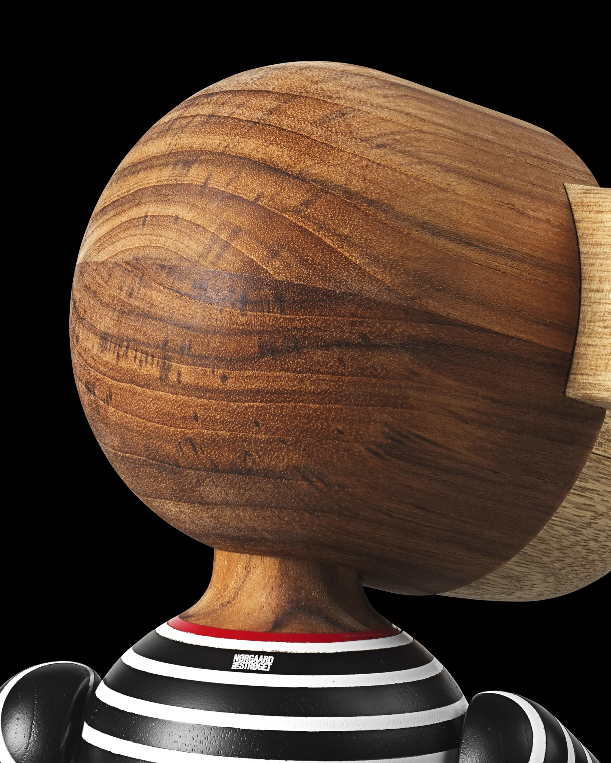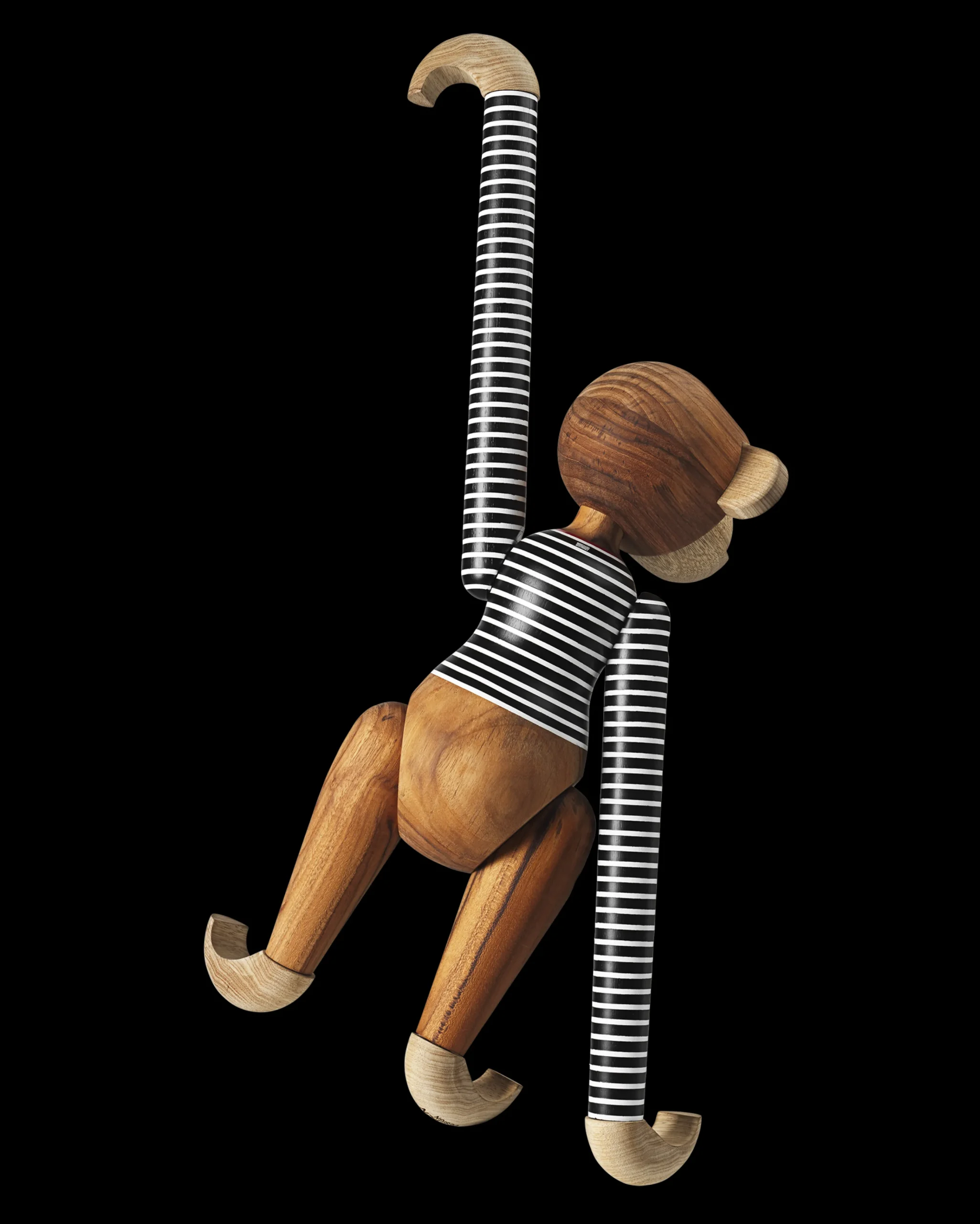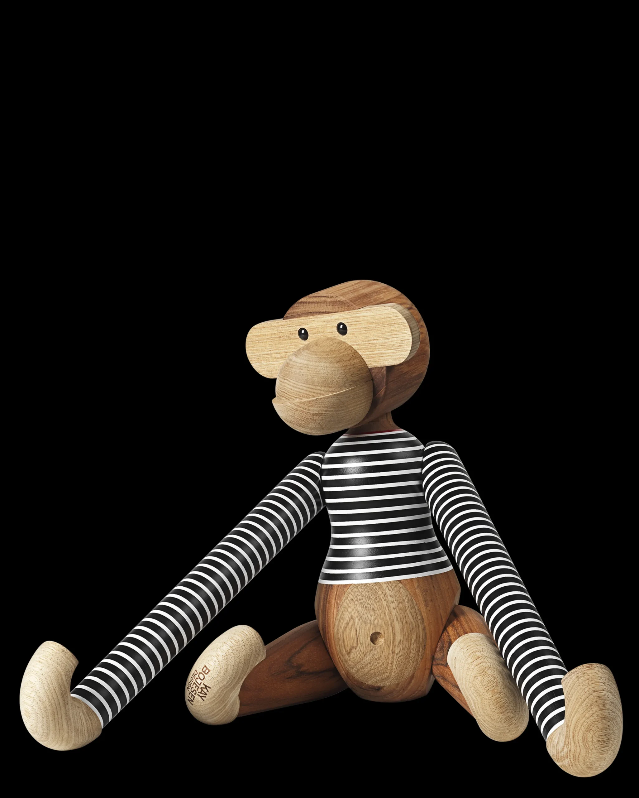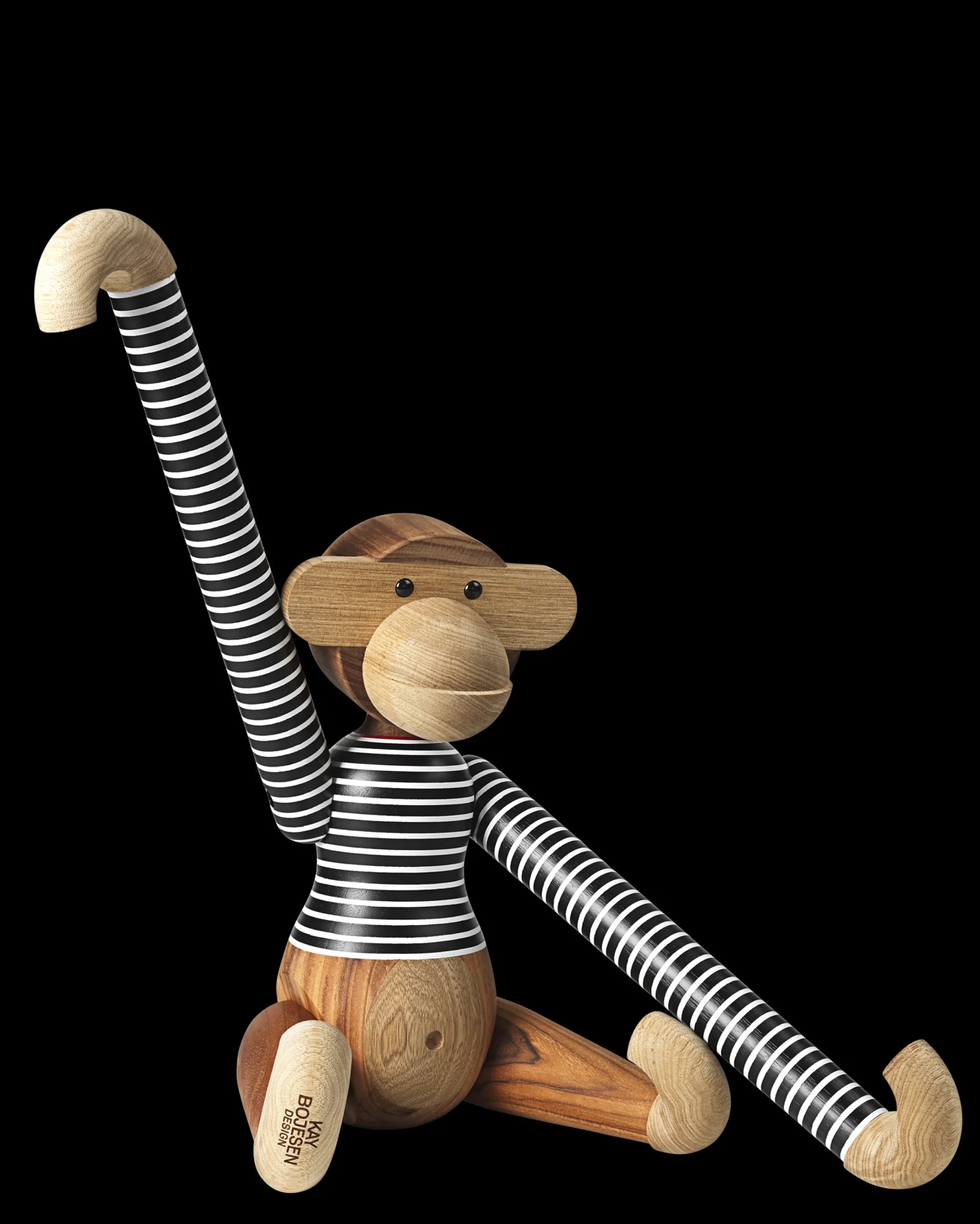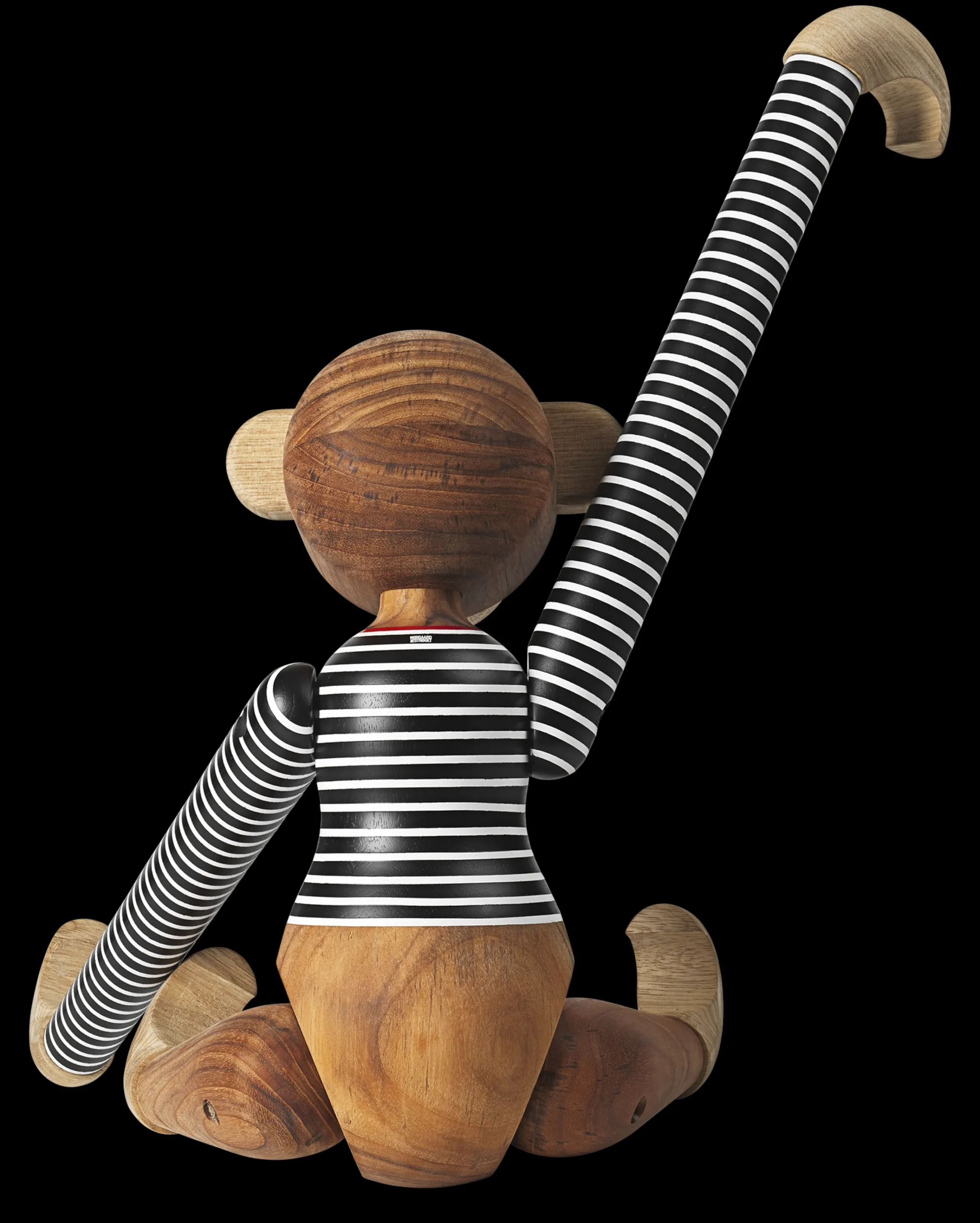 To af de mest ikoniske pejlemærker i dansk designhistorie er gået sammen for at hylde de smilende linjer og glade striber, de hver især har bidraget med til dansk design. Den berømte Kay Bojesen Abe blev skabt tilbage i 1951, da Kay Bojesen ville lave en knage i børnehøjde, så hans børn kunne nå tøjet, men i stedet endte han med at lave et verdenskendt dansk designikon. Nu har den ikoniske Abe selv fået tøj på. Og hvad klæder bedre et dansk designikon end et andet dansk designikon? Den store Kay Bojesen Abe x Nørgaard paa Strøget er fremstillet i FSC®-certificeret teak og limba og måler 47 cm i højden. Du kan få Aben med den flotte påmalede Nørgaard paa Strøget #101 T-shirt i enten denne sort med hvide striber eller hvid med sorte striber. Begge farvevarianter er med den velkendte røde halskant, du kun finder på #101 T-shirts i den eksklusive Nørgaard paa Strøget-version i butikken på Amagertorv i København. Kay Bojesen er synonym med original dansk formgivning og design. Og samarbejdet med Mads Nørgaard binder kærligheden til holdbare og varige produkter sammen og tilføjer samtidig netop den leg og finurlighed, som Kay Bojesen selv elskede at tilføje til sine designs for at sætte fantasien i gang og skabe originale fortællinger i træ. Den ikoniske Abe i nye klæder er en sjov og uhøjtidelig fejring af begge designikoner, hvor vi med et glimt i øjet i fællesskab hylder humoren og de smilende linjer med farver og striber, der trækker tråde langt ind i dansk designhistorie.u003cbru003eDer kan opleves variation i striberne, hvilket betyder, at hver abe sin helt egen unikke personlighed. Det skyldes, at striberne bliver omhyggeligt påført hver enkelt Abe x Nørgaard på Strøget gennem en håndholdt proces.