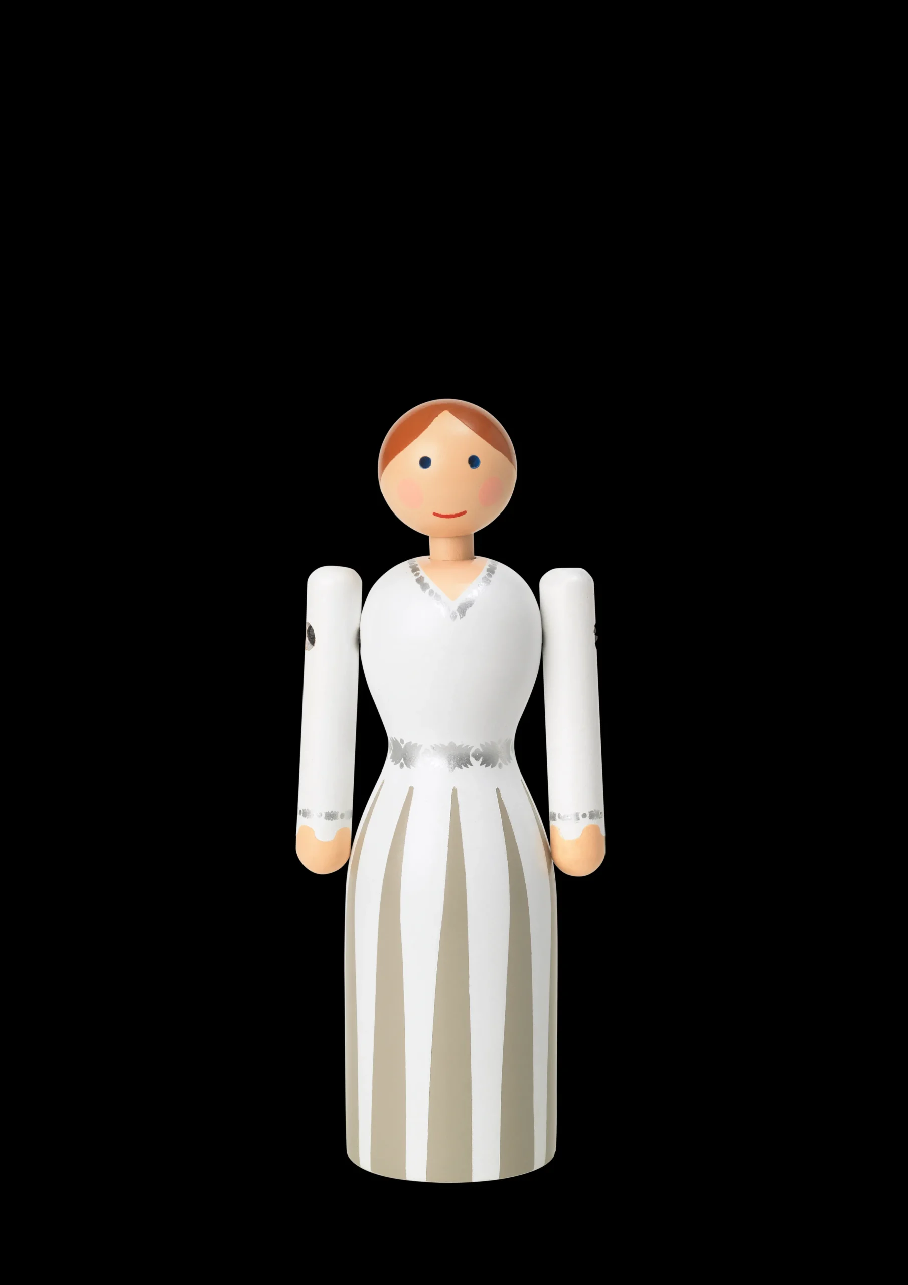 Fuldend bryllupskagen med topfigurer fra Kay Bojesen på den store dag. Mon ikke gæsterne vil blive overraskede over at se dansk design i toppen af kagen, når I samles ved kagebordet? Og når dagen er omme, har brudeparret et originalt minde om den store dag, som man har lyst til at have stående fremme. De nye topfigurer fra Kay Bojesen er miniudgaver af Bruden og Gommen, der er inspireret af originale figurer fra Kay Bojesens arkiver, og kommer ligesom de større figurer i FSC®-certificeret bøgetræ med håndmalede detaljer udført med stor præcision. Den yndige Brud er i en gulvlang, hvid kjole med lange ærmer, læg og feminine sølvdetaljer i form af et bånd om livet og ved håndleddene, der er designet som en lille hyldest til de ornamenter, Kay Bojesen lavede i sin tid som sølvsmed. Håret er tilbagestrøget i en enkel frisure, som på Kay Bojesens originale figurer, kinderne er røde og smilet er venligt og imødekommende. Figuren måler 12 cm og sælges enkeltvis, så parret kan sammensættes helt, som det ønskes. En diskret, hvid magnetisk plade, der holder figurerne sikkert på plads, kan tilkøbes. Designet er som altid hos Kay Bojesen enkelt og elegant, og i kraft af figurernes klassiske udtryk vil de passe til alle typer kager – både den minimalistiske, den farverige og kagen fuld af pynt.