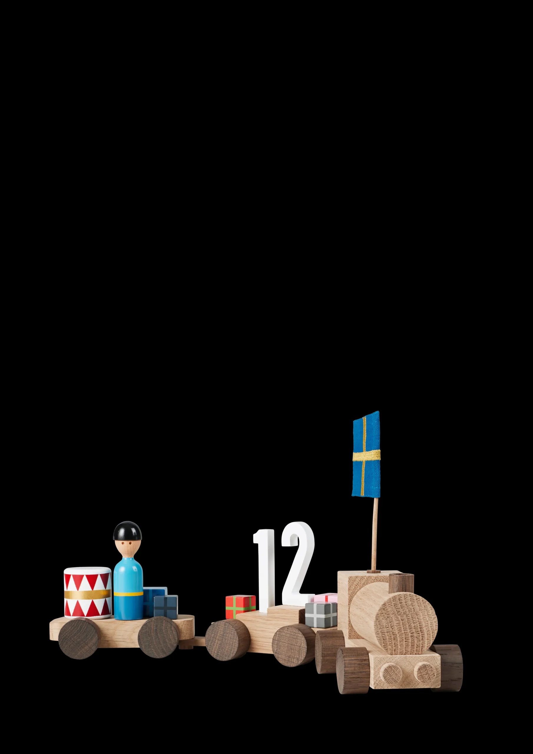 Det fine fødselsdagstog er inspireret af et originalt Kay Bojesen-tog og skal selvfølgelig bruges som en dekorationsgenstand ved fejring af fødselsdage, men det fungerer også perfekt som pynt på hylden, så du hver dag kan nyde Kay Bojesens originale fortællinger i træ. De tre vogne er prydet med flag, farverige pakker, tal, den lille garder og en tromme – alle festlige elementer fra Kay Bojesens univers. Du får med Kay Bojesen-fødselsdagstoget også tal fra 0 til 9 (2 stk. 1-taller), der ligesom flaget kan sættes i flere huller i vognene, så du kan skabe lige præcis den kombination, du bedst kan lide. ADVARSLER: Ikke egnet til børn under 3 år. Fjern al emballage inden brug. Fødselsdagstoget er IKKE et legetøj og kan KUN bruges til dekoration. Sørg for ikke at efterlade fødselsdagstoget uden opsyn.