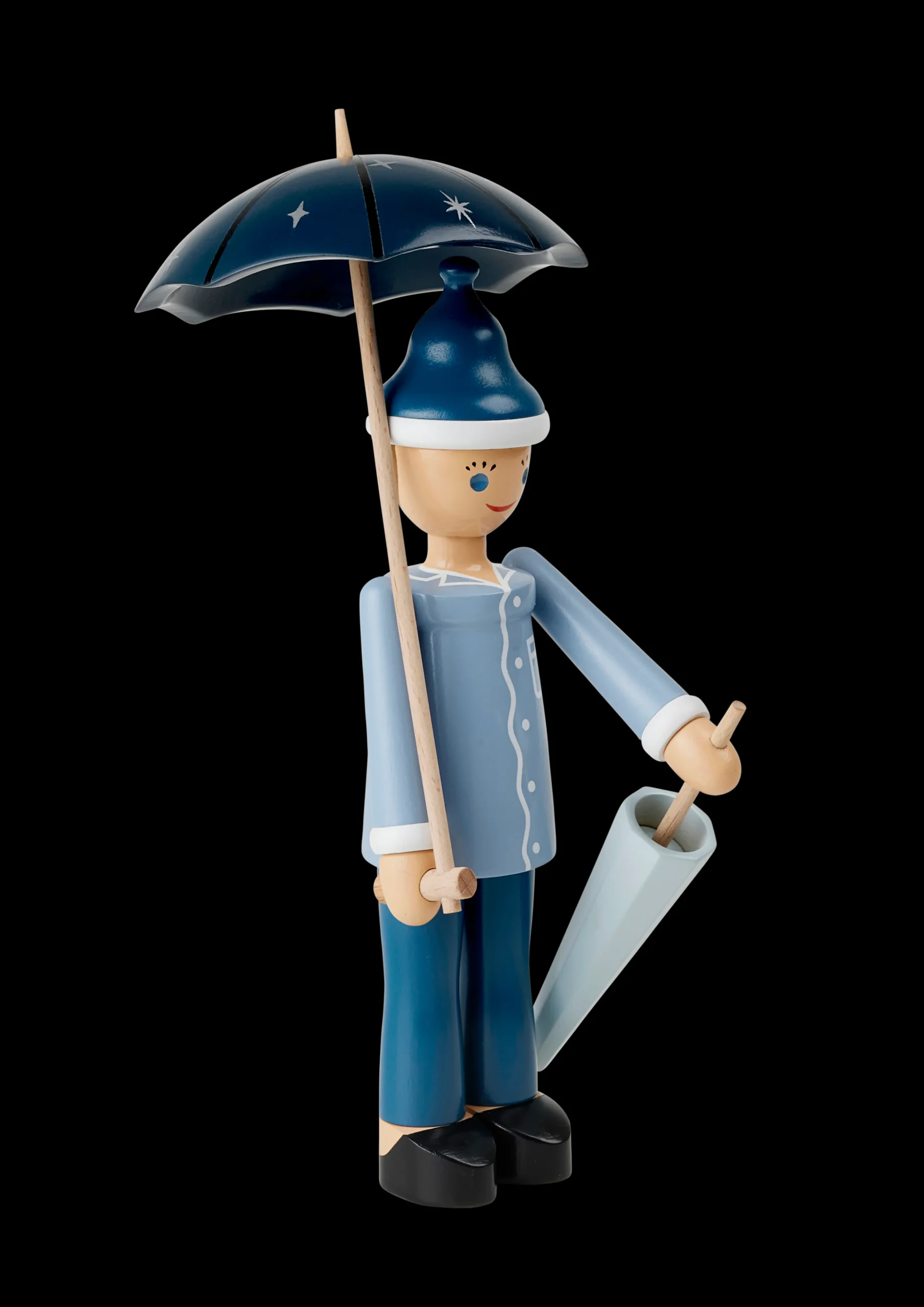 Nattergalen, Hyrdinden og Skorstensfejeren er allerede på hylderne i museumsbutikken i Odense og på rosendahl.com, og de får nu selskab af Ole Lukøje, som du også vil kunne finde i din lokale designbutik. Iført lyseblå natskjorte, mørkeblå natbukser, tøfler og en lille hue står Ole Lukøje glad og smilende med sine to paraplyer. Farverne er rolige og holdt i kølige nuancer af blå. Ole Lukøje er drejet i FSC®-certificeret bøgetræ, og den manuelle produktion med maling og tryk er udført med den store præcision og omhyggelighed, der kendetegner træfigurerne fra Kay Bojesen. Formen er baseret på de originale Ole-figurer fra Kay Bojesens arkiv, der er enkel og minimalistisk, men fuld af liv og sjæl – så Ole Lukøje får den følelse af magi og eventyr, der er i tråd med Kay Bojesens ånd og den historiefortælling, han formåede at skabe, når han designede sine fantasifulde figurer. Vær opmærksom på, at Ole Lukøje er ikke skabt med justerbare dele som arme eller ben. Vi opfordrer derfor til, at paraplyen monteres med forsigtighed, og at begge paraplyer monteres for at opnå den optimale balance.