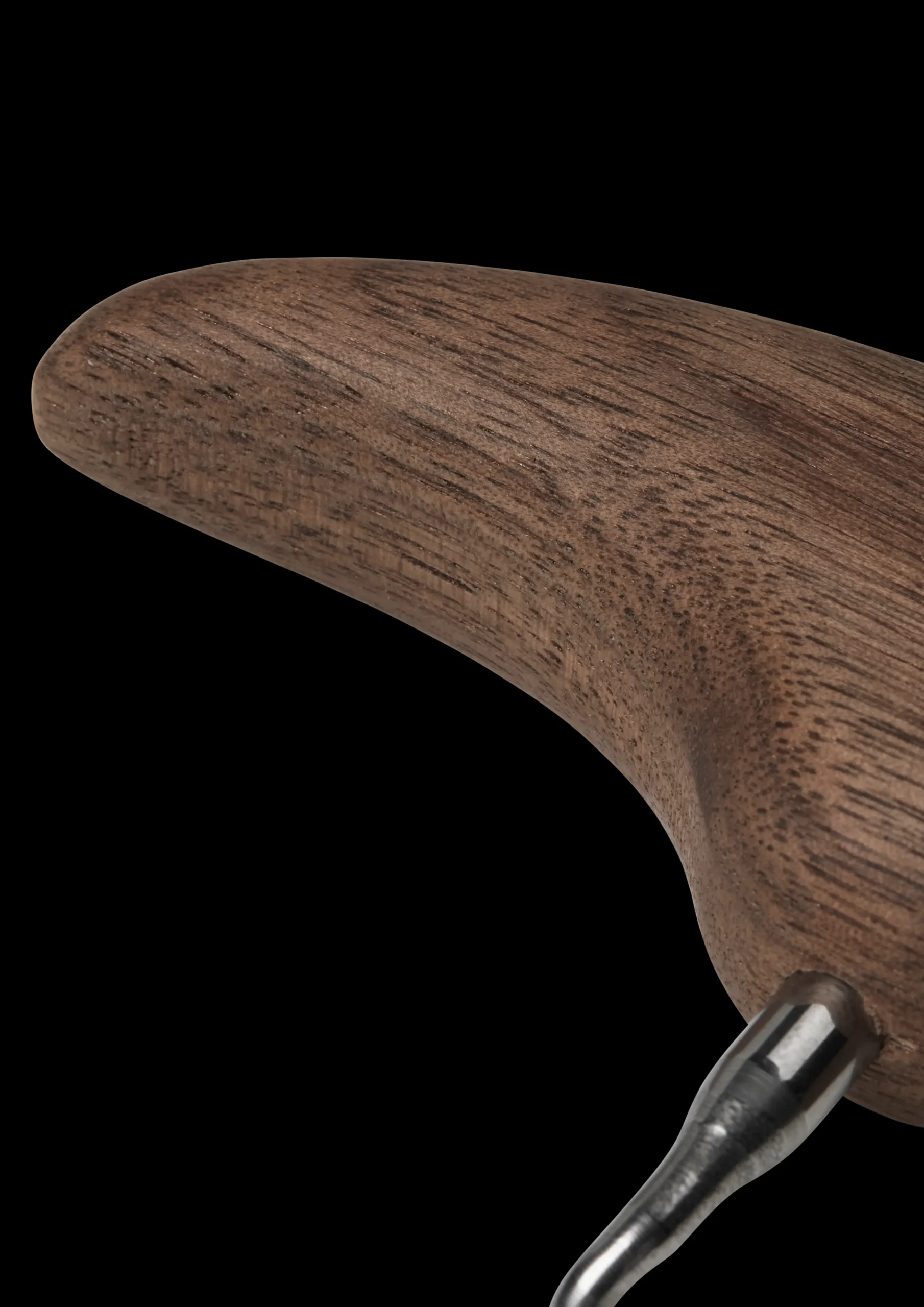 I Menageri-serien kommer nu en oplukker og en proptrækker i mørk valnød, der giver et eksklusivt look. Begge dele er smukt forarbejdede og rare at røre ved, så du både får en æstetisk og en taktil oplevelse, når du åbner en flaske. Grebet er lækkert og både proptrækker og oplukker ligger godt i hånden. Du både ser og fornemmer tydeligt Kay Bojesens velkendte runde og bløde formsprog, der er hans signatur. Samlere og kendere vil kunne genkende både oplukkeren og proptrækkeren, der begge er originale designs fra Kay Bojesens hånd, der nu genintroduceres i mørk valnød, som står i flot kontrast til det blanke stål. Et lille diskret logo er præget i træet, der er behandlet med olie. Det bringer årerne i træet frem og gør træet slidstærkt.