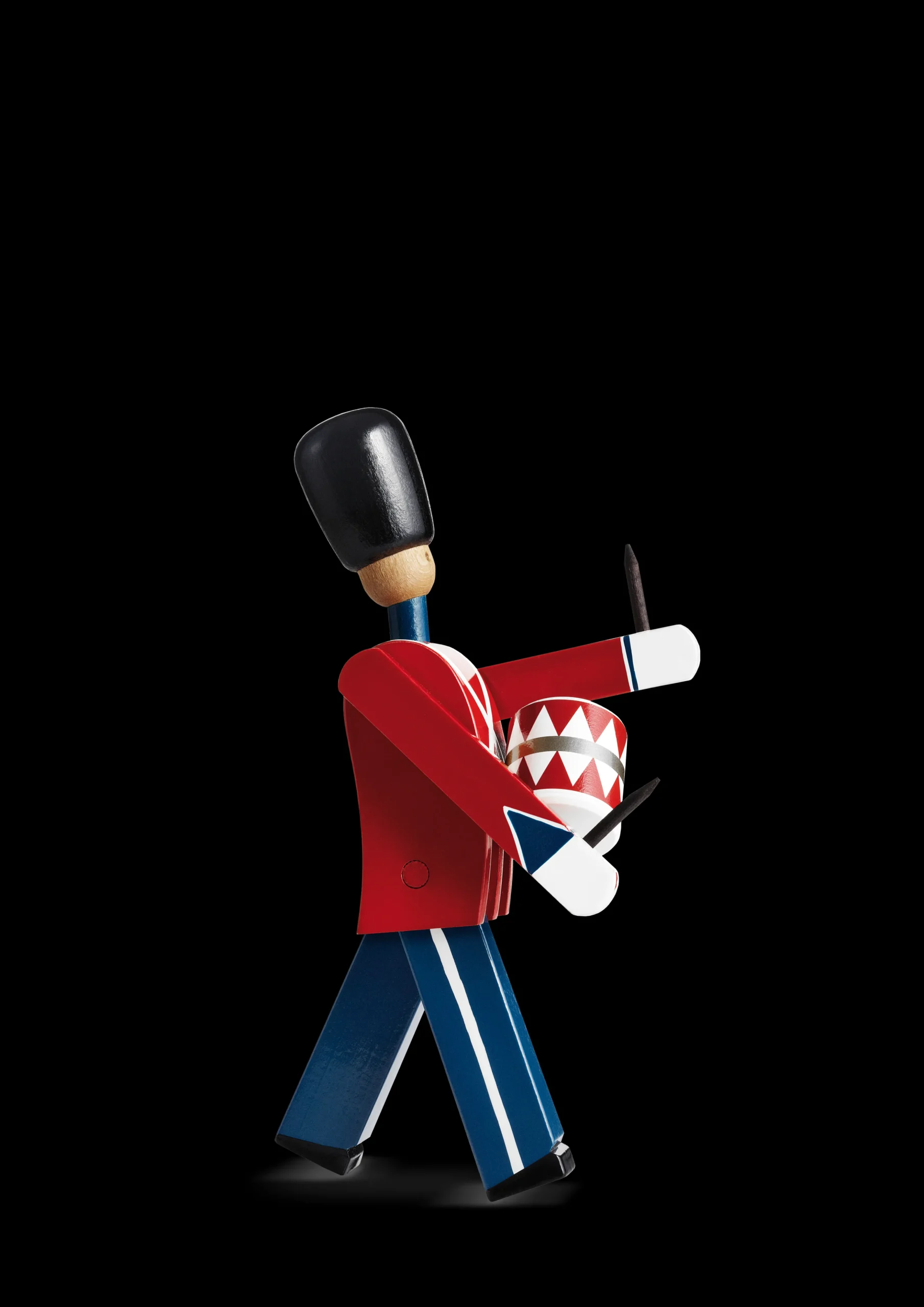 Inspireret af et af Danmarks nationalsymboler fra Amalienborg Slotsplads skabte Kay Bojesen i 1942 sine håndmalede gardere. Lige siden har Trommeslageren, Fanebæreren og den Menige garder med gevær været stolte repræsentanter for dansk kvalitetsdesign. En god gaveide for livet til både børn og voksne. Vær forsigtig når trommestikkerne placeres. Rul forsigtigt trommestikkerne ind i trommeslagerens hånd ved brug af begge hænder.