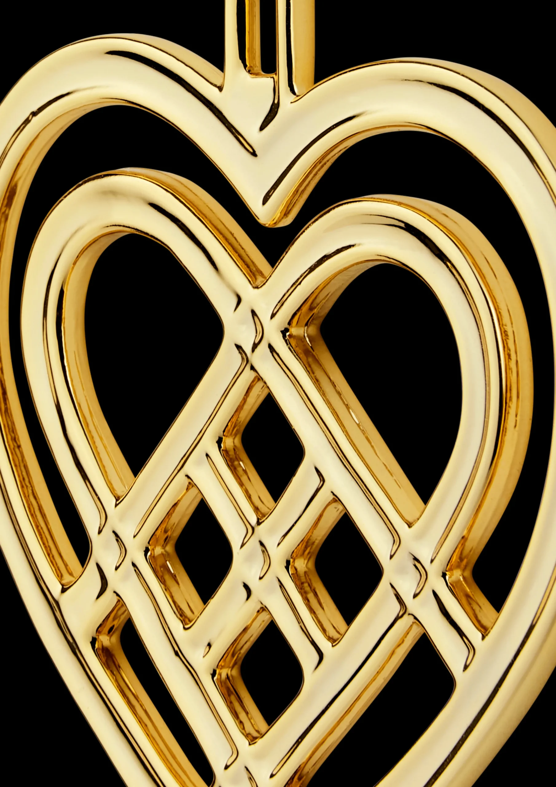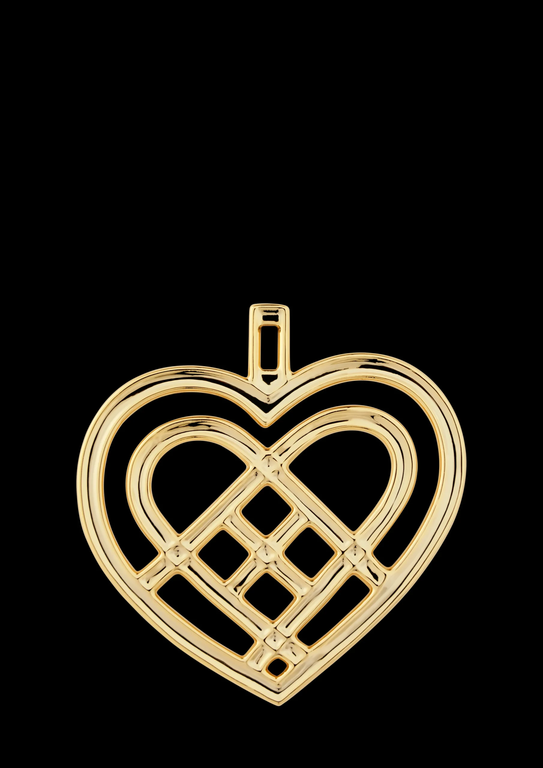 Klassisk julepynt med kunstnerisk kant. Rosendahls Karen Blixens Jul er for mange indbegrebet af den hyggelige og traditionelle jul – fuld af historie og julesymbolik, der får juleglæden til at holde helt indtil juleaften. Ole Kortzau lavede sin første Karen Blixen-julepynt tilbage i 2007. Og hvert år kommer der nye ophæng til i den særlige håndlavede kvalitet skabt med omhyggelighed og øje for detaljen i en sådan grad, at hvert enkelt ophæng fremstår som et lille kunstværk i sig selv, belagt med ægte sølv og guld. 2024-kollektionen rummer blandt andet dette forgyldte ’flettede julehjerte’, der smelter sammen med og omkranses af et større hjerte – et symbol på kærlighed og samvær i juletiden. Ligesom de andre små ophæng i serien er det ca. 7 cm i højden og fungerer perfekt som vinduespynt. Motiverne i Karen Blixens Jul er ofte en kærlighedserklæring til børnenes perspektiv på julen. Men selvom Ole Kortzaus julehistorier tager udgangspunkt i virkeligheden, så er de ikke virkeligheden. Derfor er der også altid lige puffet lidt til motiverne. De er altid lidt skæve, lidt underfundige. Ole Kortzau vil have os til stoppe op, tage en pause – og opdage alle de klassiske karakterer på en anden måde. Det trænede øje vil da også lægge mærke til, at de to hjerter i dobbelthjertet med designerens egne ord er ’fuldstændig vinde og skæve’.nDette juleophæng leveres med en fin rød snor.