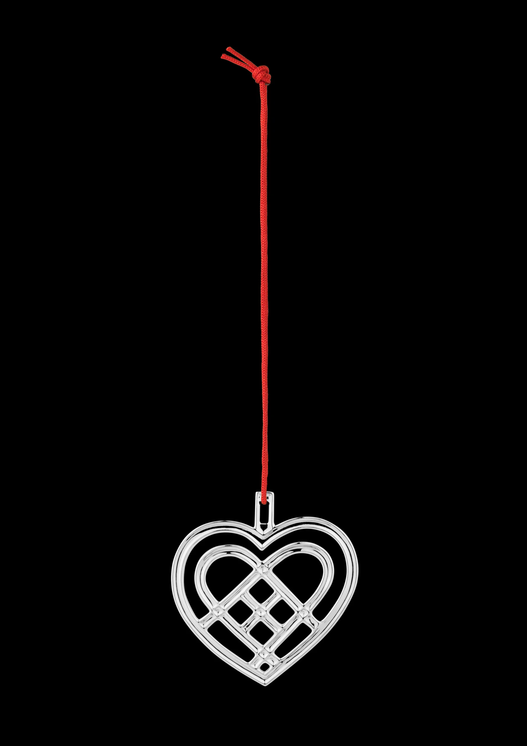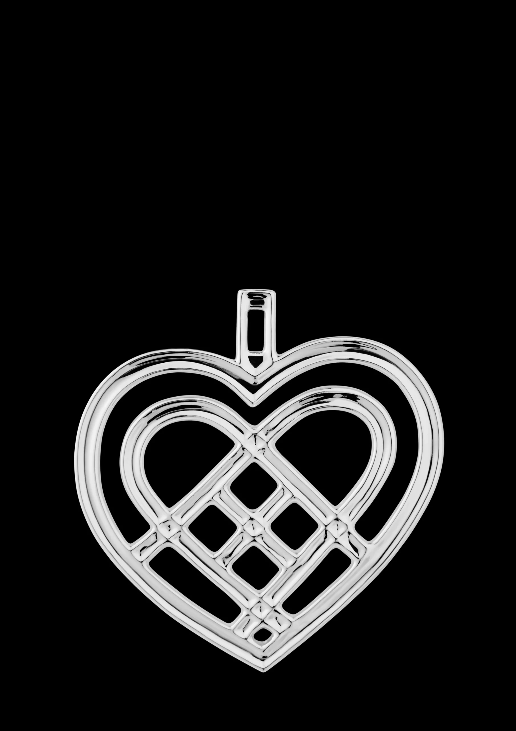 Klassisk julepynt med kunstnerisk kant. Rosendahls Karen Blixens Jul er for mange indbegrebet af den hyggelige og traditionelle jul – fuld af historie og julesymbolik, der får juleglæden til at holde helt indtil juleaften. Ole Kortzau lavede sin første Karen Blixen-julepynt tilbage i 2007. Og hvert år kommer der nye ophæng til i den særlige håndlavede kvalitet skabt med omhyggelighed og øje for detaljen i en sådan grad, at hvert enkelt ophæng fremstår som et lille kunstværk i sig selv, belagt med ægte sølv og guld. 2024-kollektionen rummer blandt andet dette forsølvede ’flettede julehjerte’, der smelter sammen med og omkranses af et større hjerte – et symbol på kærlighed og samvær i juletiden. Ligesom de andre små ophæng i serien er det ca. 7 cm i højden og fungerer perfekt som vinduespynt. Motiverne i Karen Blixens Jul er ofte en kærlighedserklæring til børnenes perspektiv på julen. Men selvom Ole Kortzaus julehistorier tager udgangspunkt i virkeligheden, så er de ikke virkeligheden. Derfor er der også altid lige puffet lidt til motiverne. De er altid lidt skæve, lidt underfundige. Ole Kortzau vil have os til stoppe op, tage en pause – og opdage alle de klassiske karakterer på en anden måde. Det trænede øje vil da også lægge mærke til, at de to hjerter i dobbelthjertet med designerens egne ord er ’fuldstændig vinde og skæve’.nDette juleophæng leveres med en fin rød snor.