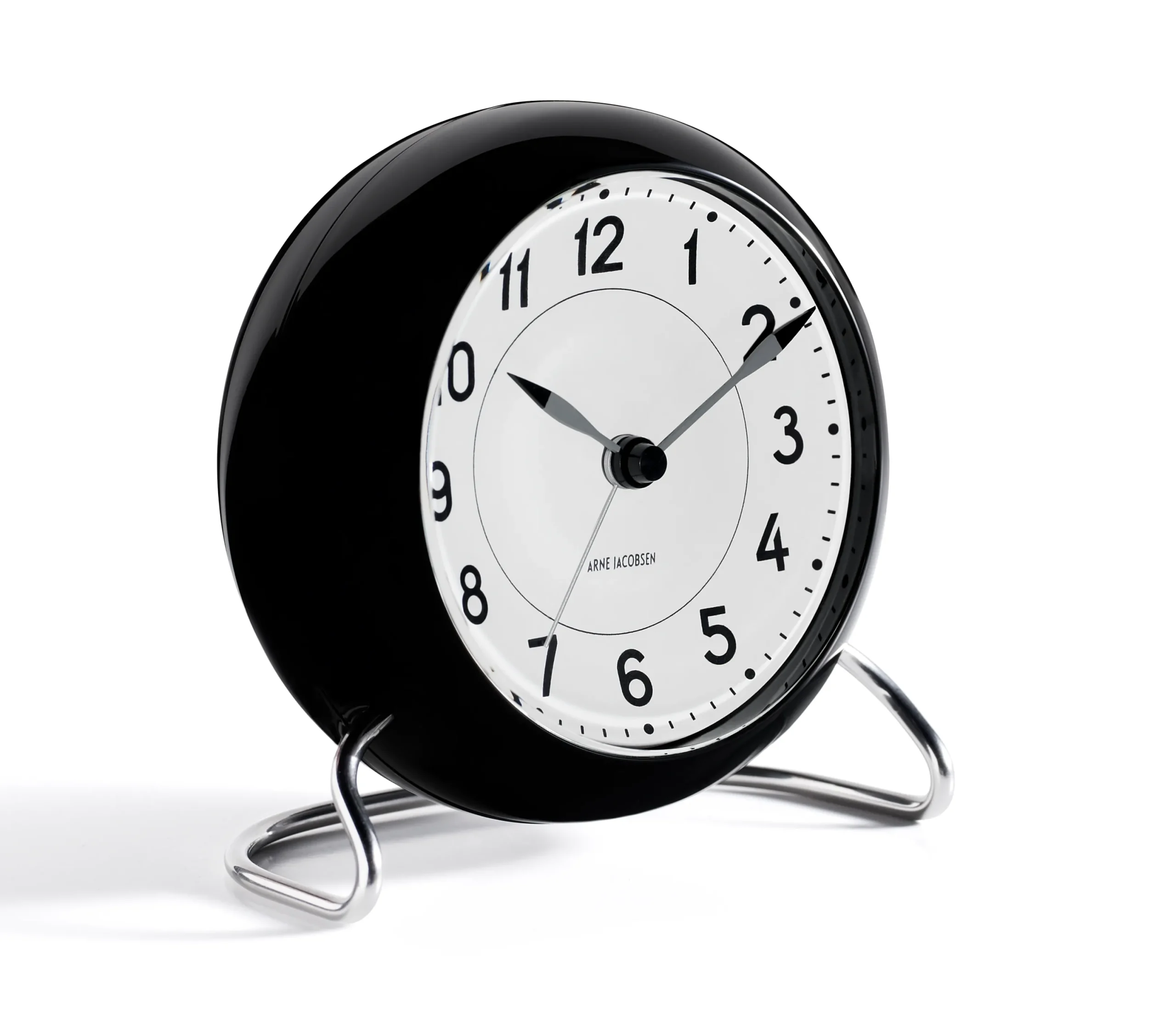 Arne Jacobsens LK bordur med sin svungne metalfod blev i 1941 opdateret, da fremstillingen af dobbeltviserne blev for dyr. Jacobsen designede i stedet Station urskiven, der med sin enkle visning af tiden fremstår nærmest Bauhaus’k i sit udtryk. Uret er nu opdateret med både alarm, snoozefunktion og lys, der udløses af en usynlig sensor på toppen af uret. Arne Jacobsens arkitektur og design vakte opsigt overalt dengang. Det magiske er, at det stadig forholder sig sådan.