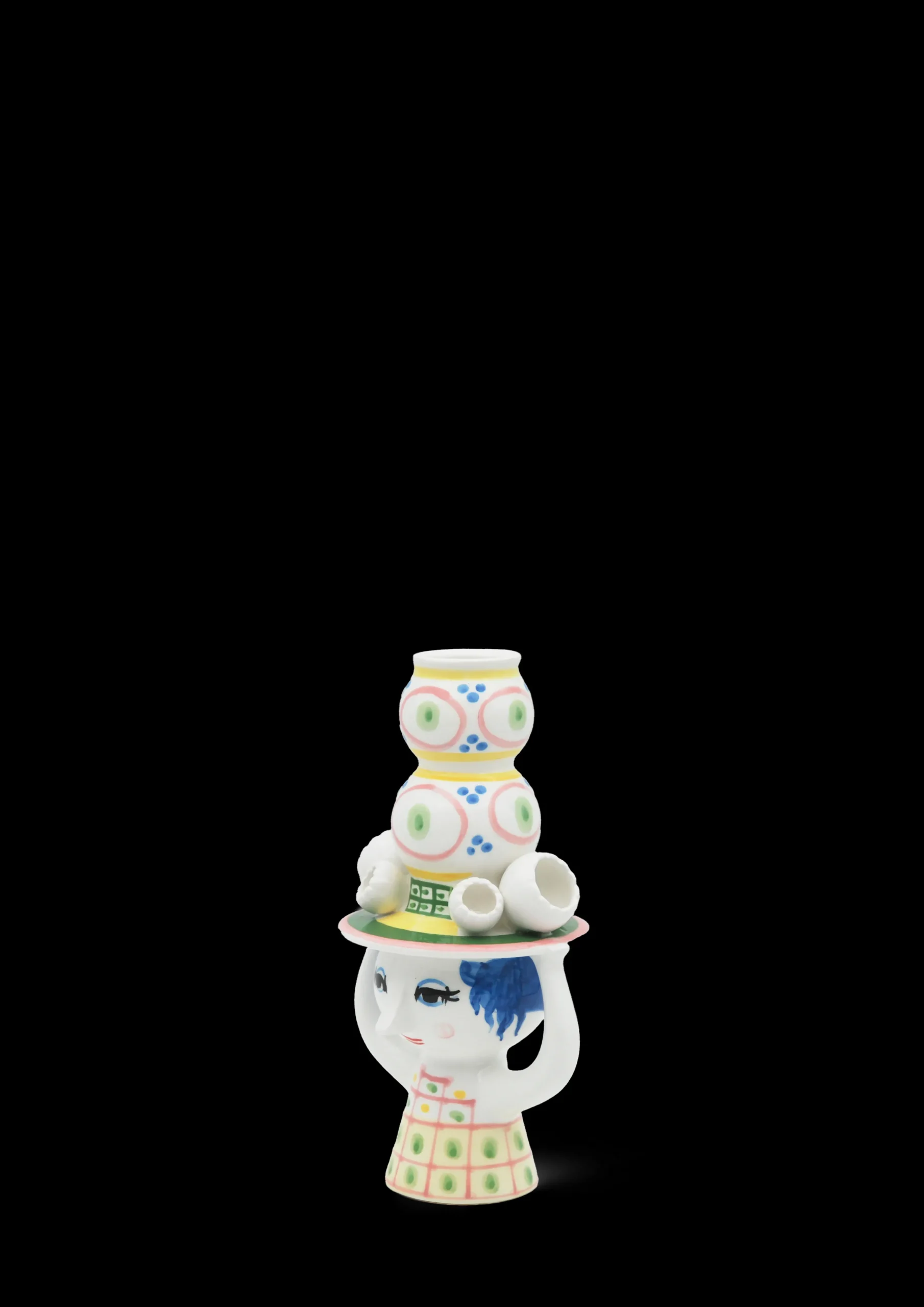 Invitér den nye hattefrøken indenfor, og lad hende skabe glæde i boligen med sine fine farver, finurlige detaljer og håndmalede dekorationer. Bjørn Wiinblad havde en forkærlighed for figurer med hatte, og arkiverne rummer utallige eksempler på, hvordan hatten dukker op igen og igen på nye, kreative og legende måder. Han designede selvfølgelig ikke små, fine pyntehatte. Nej, det var store voluminøse kreationer, der var både skulpturelle og avantgarde i deres udtryk – præcis som i serien Lady with hat. Lysestagen i blankglaseret keramik med en højde på 16 cm er overvejende lyserød i udtrykket og har detaljer i grøn, gul og blå. Som et lille tårn vokser hatten op mod himlen, mens den fine frøken balancerer hatten med sine hænder. Det giver lysestagen et finurligt og fantasifuldt udtryk perfekt i den legende boligindretning. Brug den til både hvide, farvede, lige og snoede lys – eller hvorfor ikke med en enkelt dekorativ tørret blomst? Designet inviterer dig til at være kreativ i din indretning. En anden detalje, der er gennemgående i serien, er de små, figurative blomster, der er placeret langs skyggen på hattene. Endnu en dekorativ detalje inspireret af Bjørn Wiinblads originale former og farver. Præcis som Bjørn Wiinblad repræsenterer Lady with hat alt, hvad der er skørt, skævt, kreativt og vidunderligt. Lysestagen er ikke beregnet til vand, men kan benyttes til tørrede blomster.