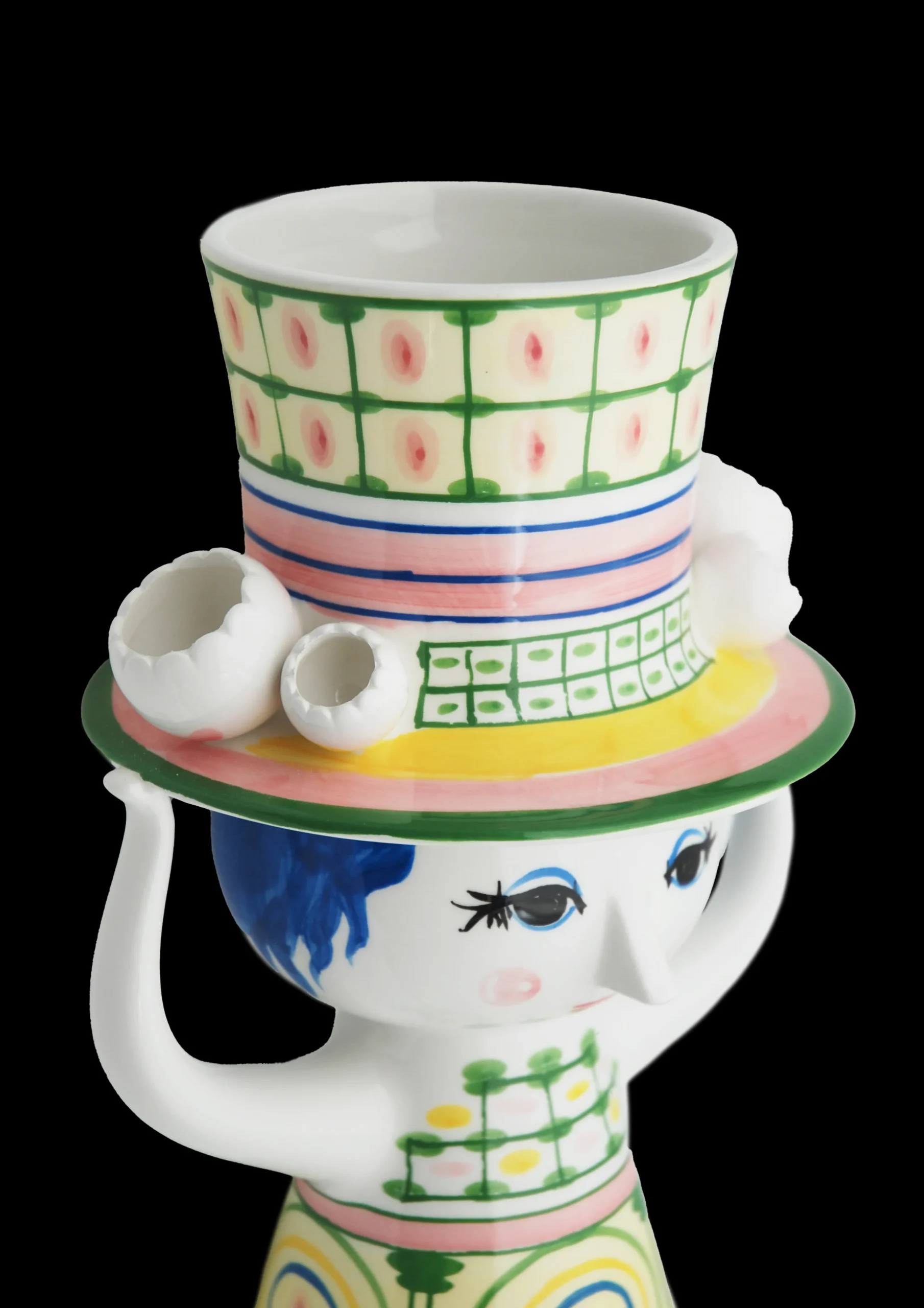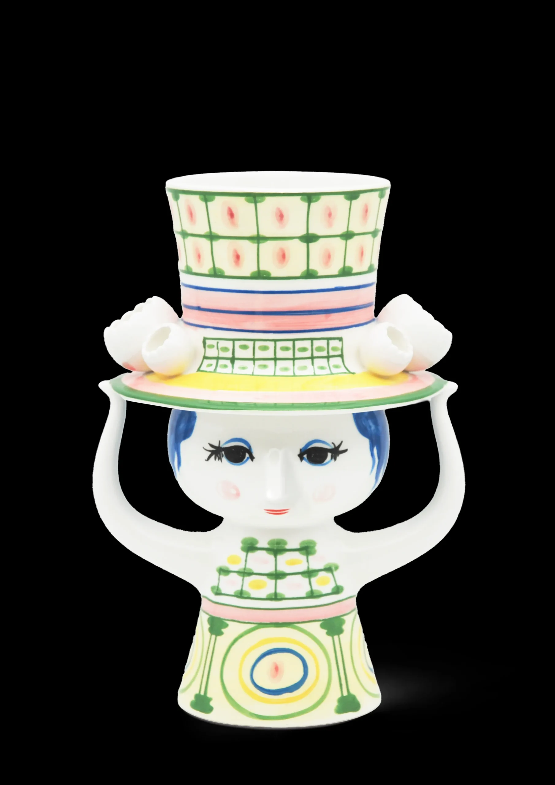 Invitér den nye hattefrøken indenfor, og lad hende skabe glæde i boligen med sine fine farver, finurlige detaljer og håndmalede dekorationer. Bjørn Wiinblad havde en forkærlighed for figurer med hatte, og arkiverne rummer utallige eksempler på, hvordan hatten dukker op igen og igen på nye, kreative og legende måder. Han designede selvfølgelig ikke små, fine pyntehatte. Nej, det var store voluminøse kreationer, der var både skulpturelle og avantgarde i deres udtryk – præcis som i serien Lady with hat. Vasen i blankglaseret keramik på 24,5 cm er præget af den grønne farve, og skørtets geometriske cirkler står i skøn kontrast til hattens tern. Som et lille tårn vokser hatten op mod himlen, mens den fine frøken balancerer den med sine hænder. Det giver vasen et finurligt og fantasifuldt udtryk perfekt til blomsterbuketten i den legende boligindretning. En anden detalje, der er gennemgående i serien, er de små, figurative blomster, der er placeret langs skyggen på hattene. Endnu en dekorativ detalje inspireret af Bjørn Wiinblads originale former og farver. Præcis som Bjørn Wiinblad repræsenterer Lady with hat alt, hvad der er skørt, skævt, kreativt og vidunderligt.