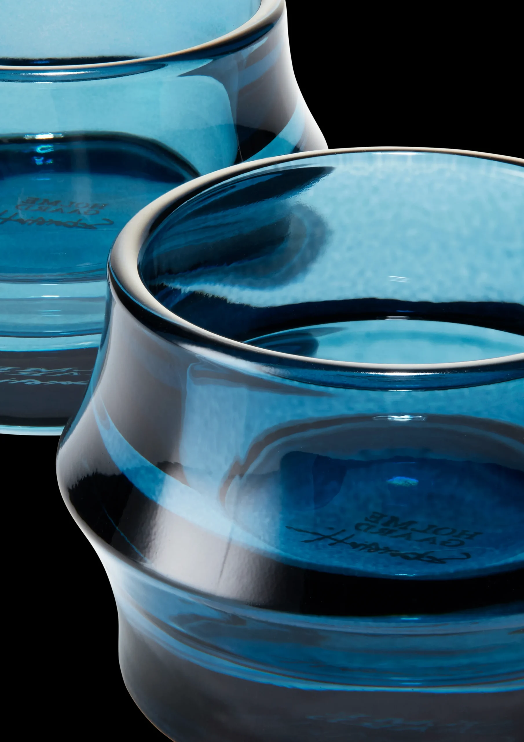 Med ARC-fyrfadsstagerne har den industrielle designer Sebastian Holmbäck i den grad spændt buen for, hvordan man med et kontrastfyldt formsprog kan skabe et innovativt design, der samtidig reflekterer essensen af Holmegaards klassiske designhistorie. De stilfulde ARC-fyrfadsstager er skabt i mørkeblåt, håndpresset glas og er i et design, der reflekterer lyset på smukkeste vis. Når flammens behagelige skær breder sig og møder glassets bløde konturer, skaber det et lille rum af ro, hvor du må overgive sig til skønheden og magien i det mundblæste intense glas. Fyrfadsstagerne, der sælges i en pakke med to, har samme kontrastfyldte formsprog som ARC-seriens vaser, urtepotter og lanterner, men de genkendelige buer er skaleret ned i størrelse, så de passer perfekt til fyrfadslys. På alle designs i ARC-serien har top og bund den samme diameter, mens ringen i midten er en smule større. Det skaber tre parallelle cirkler i smuk symmetri. Men selvom stagerne blot er 5 cm høje og 7 cm i diameter, så skaber de med deres buede former og skarpe kanter en stor effekt, når flammen er tændt og betragtes gennem det håndpressede glas.
