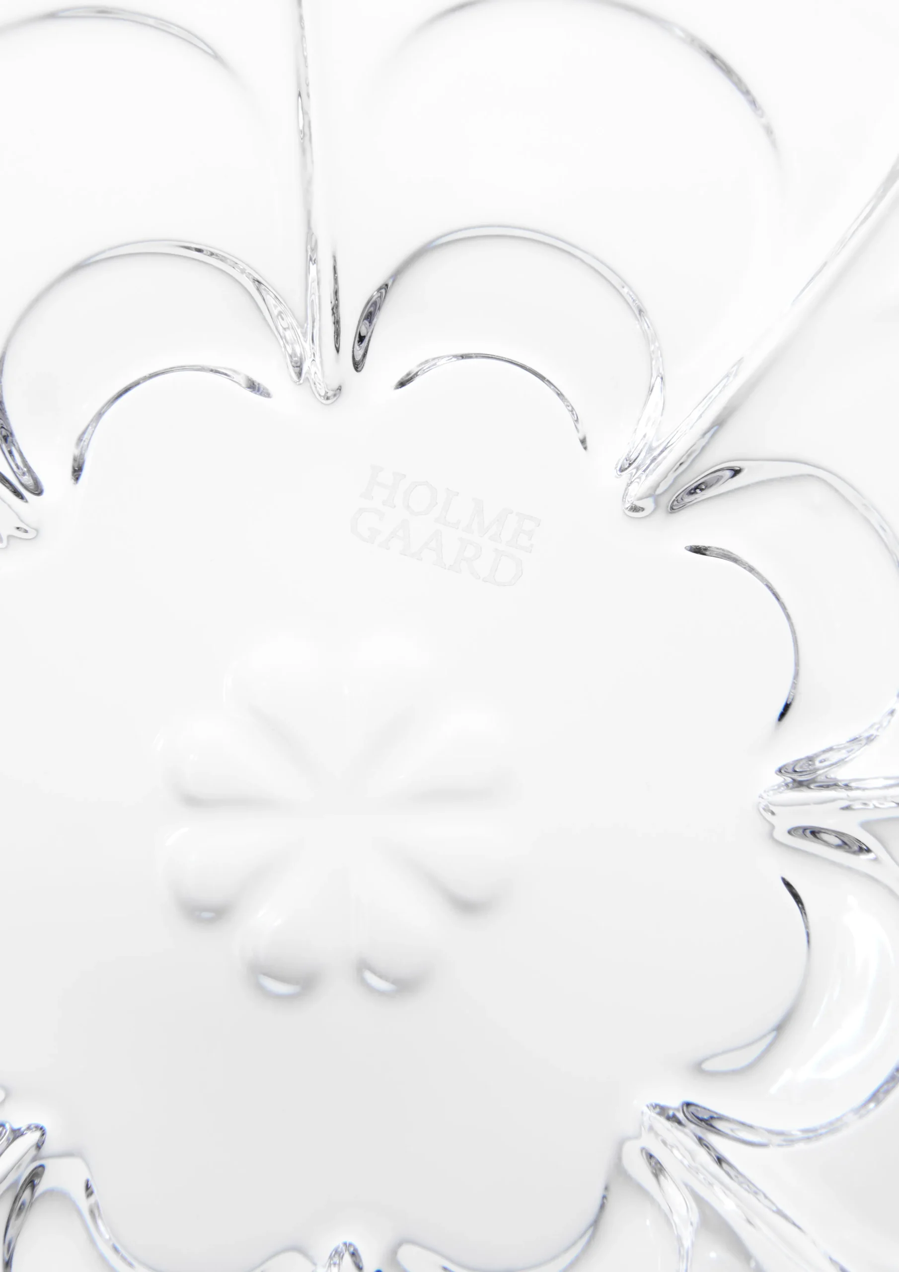 Holmegaards serie Lily er inspireret af de forskellige stadier i åkandens blomstring og har det samme lette og poetiske udtryk som den smukke blomst. Skålen i klart glas har en diameter på 13 cm og er smuk at spise af eller perfekt til servering af sukkerstykker, marmelade, karameller eller noget helt fjerde. Blomstermønsteret træder frem som relief i det formpressede glas, der både er transparent og taktilt. Linjerne i designet er enkle, bløde og organiske, men stadig på en simplificeret og stilistisk måde, så der opstår en fin balance mellem det romantiske og moderne. Skålene er nemme at stable og kan også gå i opvaskemaskinen, så du kan bruge dem til daglig uden at skulle bekymre dig om at vaske dem op i hånden. I serien findes også en stor serveringsskål, en isasiet og vandglas – alt sammen i fire forskellige farver. Alle delene i Lily-serien er skabt i gennemfarvet glas, så farven holder sig flot over tid.