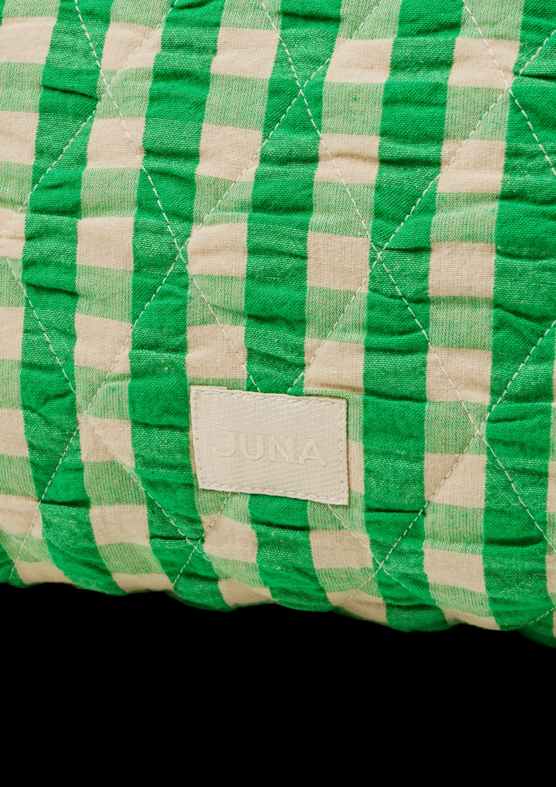 JUNA handler om glæden ved at omgive sig med tekstiler, der gør livet smukkere, blødere, mere farverigt og sjovere. Og med toilettasken Bæku0026Bølge Karla fra JUNA får du en smart og praktisk quiltet taske til alt fra tandbørste og cremer til makeup, der samtidig er nem at have med på farten. Den rummelige toilettaske måler 30x20x10 cm og kan også sagtens bruges til rejsedokumenter, skriveredskaber eller andre mindre genstande, som du gerne vil holde styr på i tasken eller derhjemme. Karla-toilettasken er syet i 100% økologisk Bæku0026Bølge-bomuld i den meget populære farvekombination grøn/sand. Som en del af JUNAs ansvarlige designfilosofi er toilettasken naturligvis som altid produceret af overskudsstof fra produktionen af JUNA-sengetøj. Den tåler maskinvask op til 40 grader, hvilket ikke blot er skånsomt for miljøet, men også for bomuldsstoffet, der får længere levetid ved den lavere temperatur.