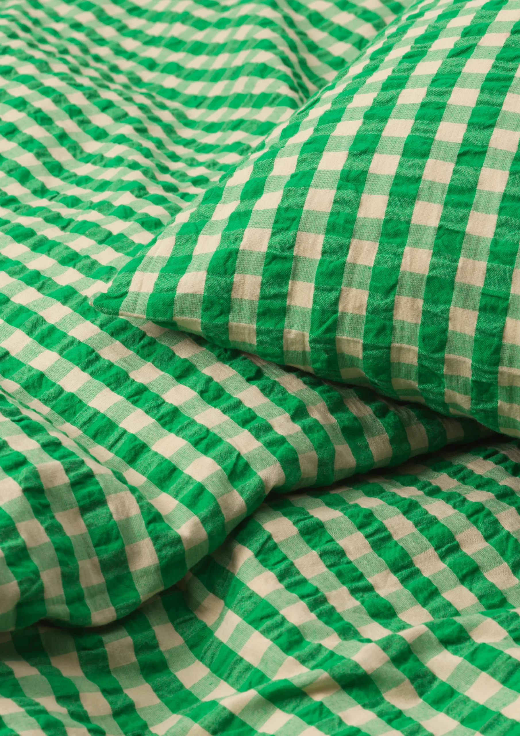 Det sæt tøj du bruger allermest tid i, er dit sengetøj. Derfor er sengetøj fra Juna skabt med intentionen om at være sanseligt, behageligt og 100% økologisk og bæredygtigt, så du trygt kan lægge dig til ro hver aften og få en god nats søvns. Juna handler om glæden ved at omgive sig med tekstiler, der gør livet smukkere, blødere, mere farverigt og sjovere. Derfor er farver og mønstre en stor del af Juna og giver sengetøjet en hyggelig og uhøjtidelig følelse. Den velkendte og klassiske ternede vævning fortolkes i en moderne farvepalet og det er netop kombinationen af det nostalgiske og nyskabende er med til at skabe en unik og glad stemning i indretningen. Den ternet Bæk u0026 Bølge i grøn/sand har en skøn friskhed og sprødhed over sig – nærmest som nyudsprungne bøgeblade. Materialet er 100% økologisk bomuld, der både er OEKO-TEX®-mærket og GOTS-certificeret. Pudebetrækket lukkes med kuvertlukning, mens dynebetrækket lukkes med knaplukning. Har du flere forskellige sengesæt fra Juna, kan du mixe og matche de forskellige farver og mønstre på kryds og tværs og skabe din helt egen stil i soveværelset. Bæk u0026 Bølge er vævet, så det har en helt speciel tekstur, der lader luften cirkulere mellem huden og dynen – perfekt til de varme sommernætter. Det giver en god nats søvn, så du kan restituere og lade op til en ny dag. Og så er det ovenikøbet strygefrit, så du kan lade den lune sommervind om tørringen og lægge sengetøjet på direkte fra tørresnoren. Sengesættet består af 1 dynebetræk på 140×200 cm og 1 pudebetræk på 60×63 cm