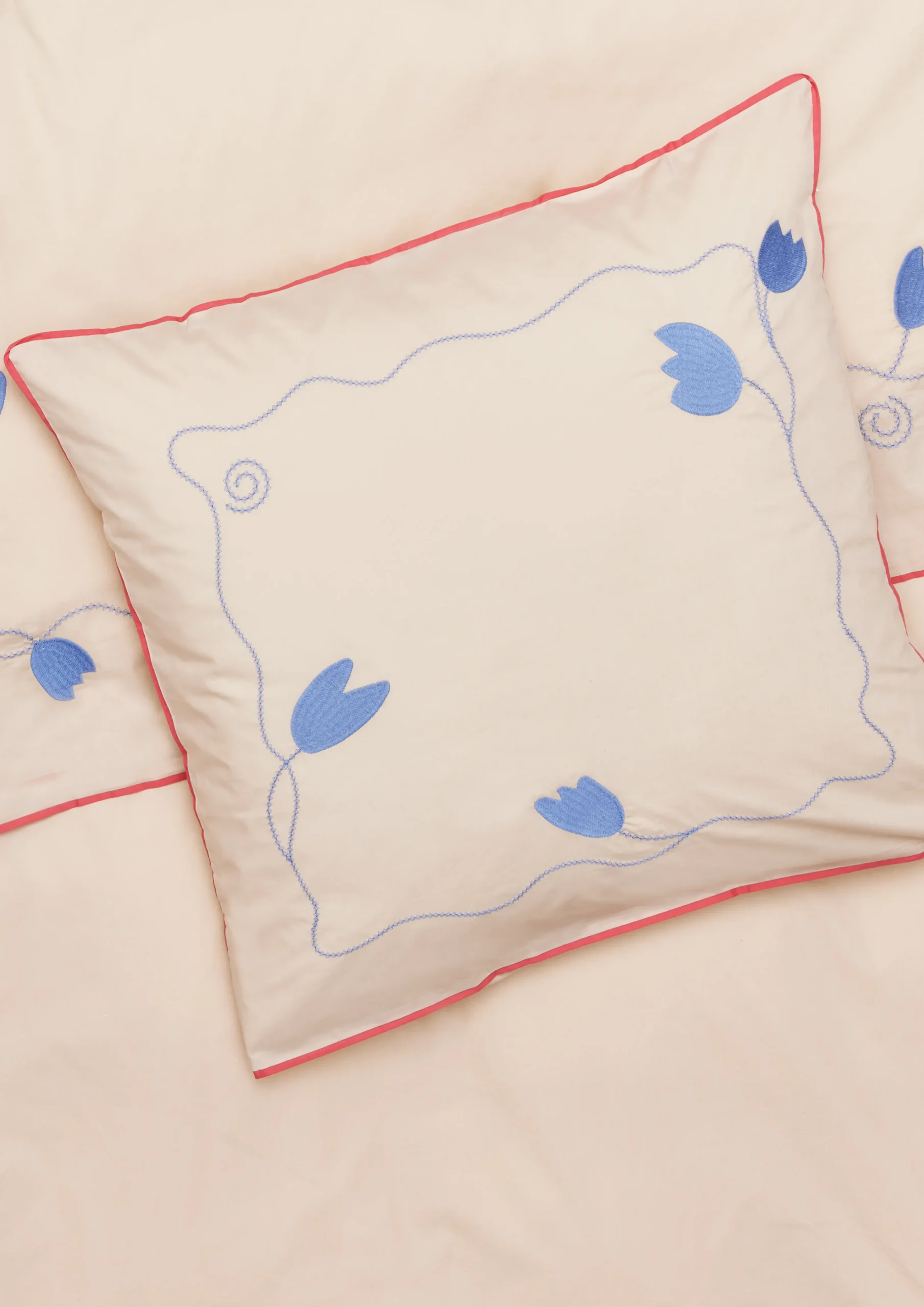 Med designsamarbejdet JUNA X KIMPOP fortolker de farverige personligheder Sofie Linde og Joakim Ingversen JUNAs drømmende univers i deres farverige, legende og unikke stil under navnet KIMPOP. Deres første kollektion Lollipop byder på bølgende kurver, overraskende linjer og moderne farvekombinationer, der skaber en farvestrålende og fantasifuld stemning i soveværelset, i sofaen, i lænestolen, på din daybed, eller hvor du ellers hygger dig i nattøj med din dyne og pude. Præcis ligesom JUNA ønsker Sofie Linde og Joakim Ingversen at skabe en hyggelig og uhøjtidelig følelse med deres tekstildesign, der inspirerer til store drømme i farverige omgivelser. Hele Lollipop-serien er desuden fremstillet i 100% økologisk bomuld, og tekstilerne er GOTS-certificeret, hvilket betyder, at du er sikret en ansvarlig produktion og tekstiler af en høj kvalitet skabt med omtanke og omsorg over for både miljø og mennesker. Sengesættet i farven sand måler 140×200 cm og har en fremtrædende rød piping hele vejen rundt langs kanten, der står i smuk kontrast til stoffets underspillede sandfarve. Desuden er både pudebetrækket og dynebetrækket dekoreret med broderede detaljer a la moderne mormor. Som en gammeldags blonde i en ny fortolkning bølger en blå blomsterranke, og dynebetrækket suppleres af en sød regnbue, der samler alle farver på tværs af hele JUNA X KIMPOP-kollektionen. Alt sammen i en skøn, umiddelbar stil. Og så gør det jo heller ikke noget, at sengetøjet også bærer OEKO-TEX®-mærket, der er din garanti for, at dit sengetøj ikke er skadeligt for din sundhed og samtidig også mindre belastende for miljøet. (GOTS ”Organic” Certified by Control Union, CU1026087)nu003cbru003eVi anbefaler altid, at du vasker dit sengetøj før brug.