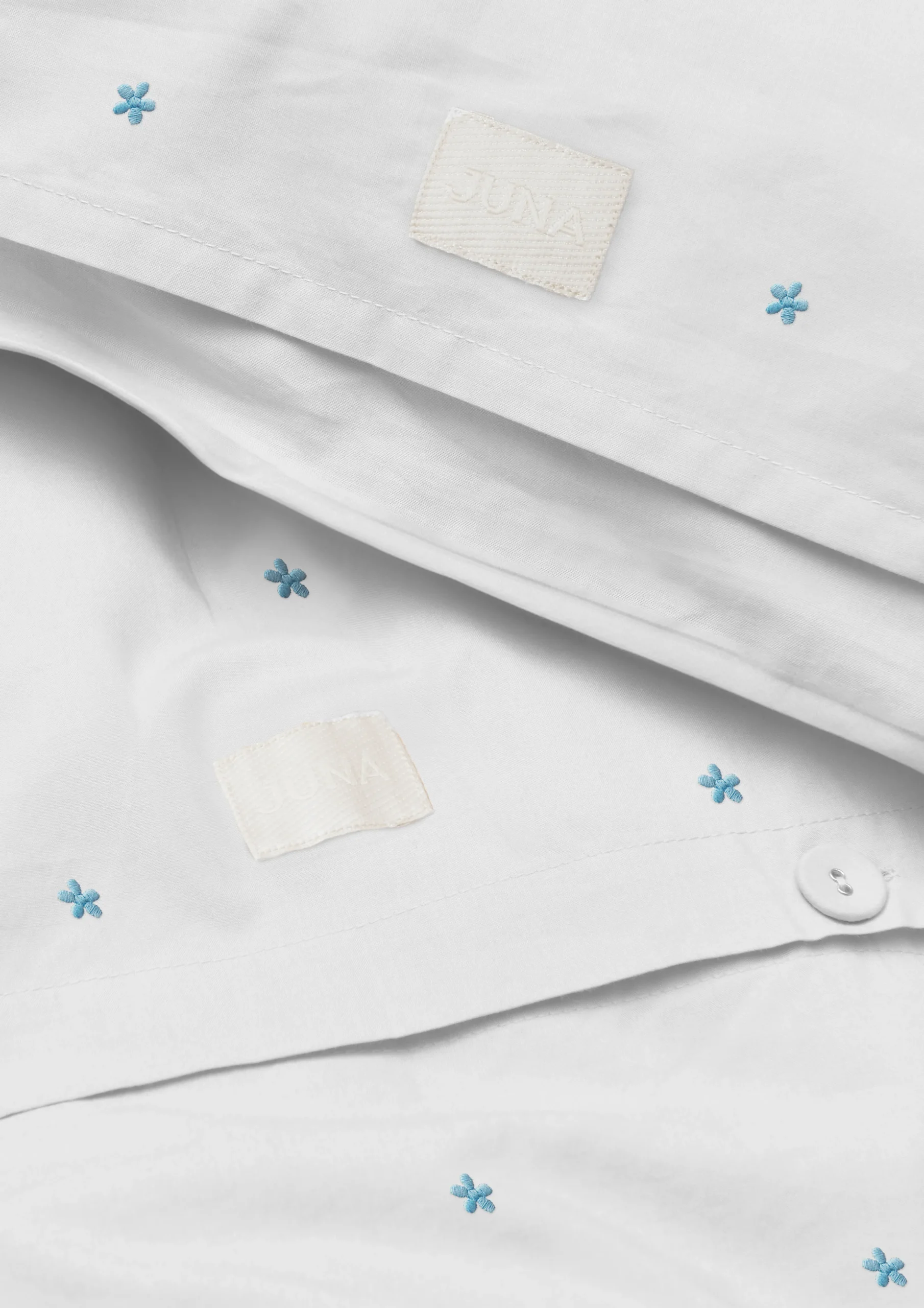 Små blomster til store drømme. Med Daisy-sengesættet fra JUNA får du en nyfortolkning af det klassiske blomsterprint, hvor en broderet blomst i kontrastfarve smukt og stilfuldt spiller sammen med JUNAs altid både enkle og moderne design. Sanseligt, behageligt og produceret ud fra ansvarlige principper. Sådan kender du sengetøjet fra JUNA. Og med Daisy-serien fortsætter JUNA i samme både vidunderlige og ansvarlige stil, hvor uendelige drømme lever og ånder side om side med en passioneret vision for ansvarlighed og cirkularitet nu og i fremtiden. Sengetøjet måler 220×220 cm, og i denne klassiske hvide version med små broderede blomster i lyseblå får du en næsten ikonisk farvesammensætning, der emmer af retrovibes, men stadig er helt tidløs. Daisy er fremstillet i 100% økologisk bomuld, der både er GOTS-certificeret og OEKO-TEX®-mærket, så du kan nyde en god nats søvn med god samvittighed. Og når du kommer helt tæt på Daisy-sengetøjet, vil du ud over detaljerne med de mange små margueritter også virkelig kunne se og mærke lækkerheden i den tætte og fine bomuldspercale, der giver stoffet en blød og glat tekstur. Samtidig med at være ekstrem behagelig at sove i får du med percalevævningen også et meget slidstærkt og holdbart sengesæt i en eksklusiv kvalitet, som du kan have glæde af nat efter nat – og år efter år. Daisy-seriens hyggelige og klassiske vibe med et moderne tvist skaber en glad og drømmende stemning i soveværelset, i sofaen, i hængekøjen, på altanen, eller hvor du nu tager din dyne og pude med hen. Det er helt op til dig, og med de forskellige Daisy-sengesæt fra JUNA kan du jo sagtens mixe og matche farver på dyner og puder på kryds og tværs og skabe din helt egen stil. (GOTS ”Organic” Certified by Control Union, CU1026087)