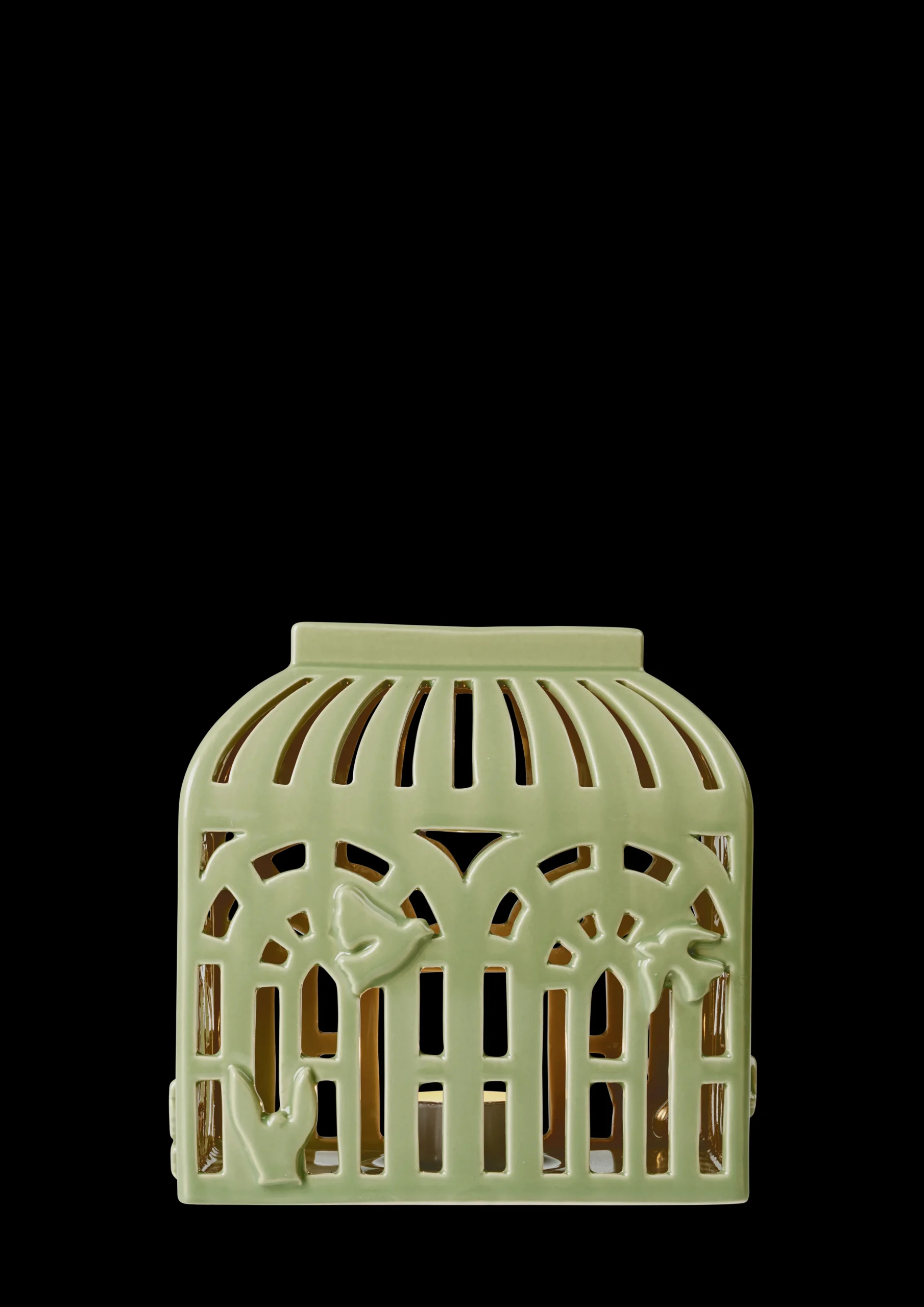 Det fine Orangery-lyshus på 16 cm er fremstillet i keramik og glaseret i den elegante og naturlige mellemgrønne farve Spring Leaf. Det er udformet som et gammeldags, romantisk orangeri, og du fornemmer tydeligt arkitekturen, stemningen og stofligheden. De mange små ruder, der udgør et orangeri, er gengivet som udskårne dekorationer i klassiske former. Herfra kan lyset fra fyrfadslyset strømme ud og skabe en hyggelig og varm stemning. Hver eneste lille udskæring er lavet i hånden ligesom de stiliserede fugle i forskellige silhuetter, der pryder ydersiden. Smukt keramisk håndværk fra Kähler, når det er bedst.