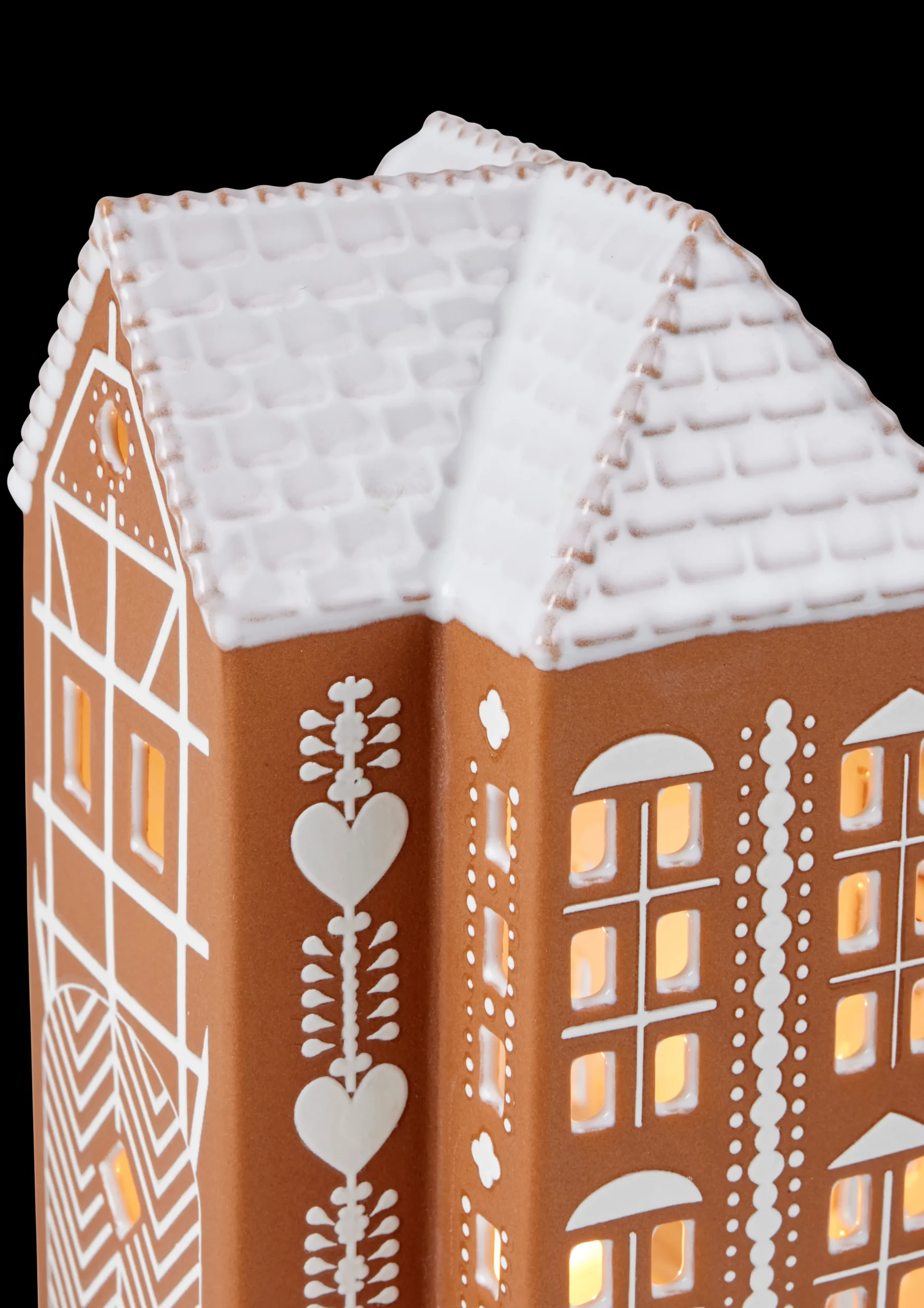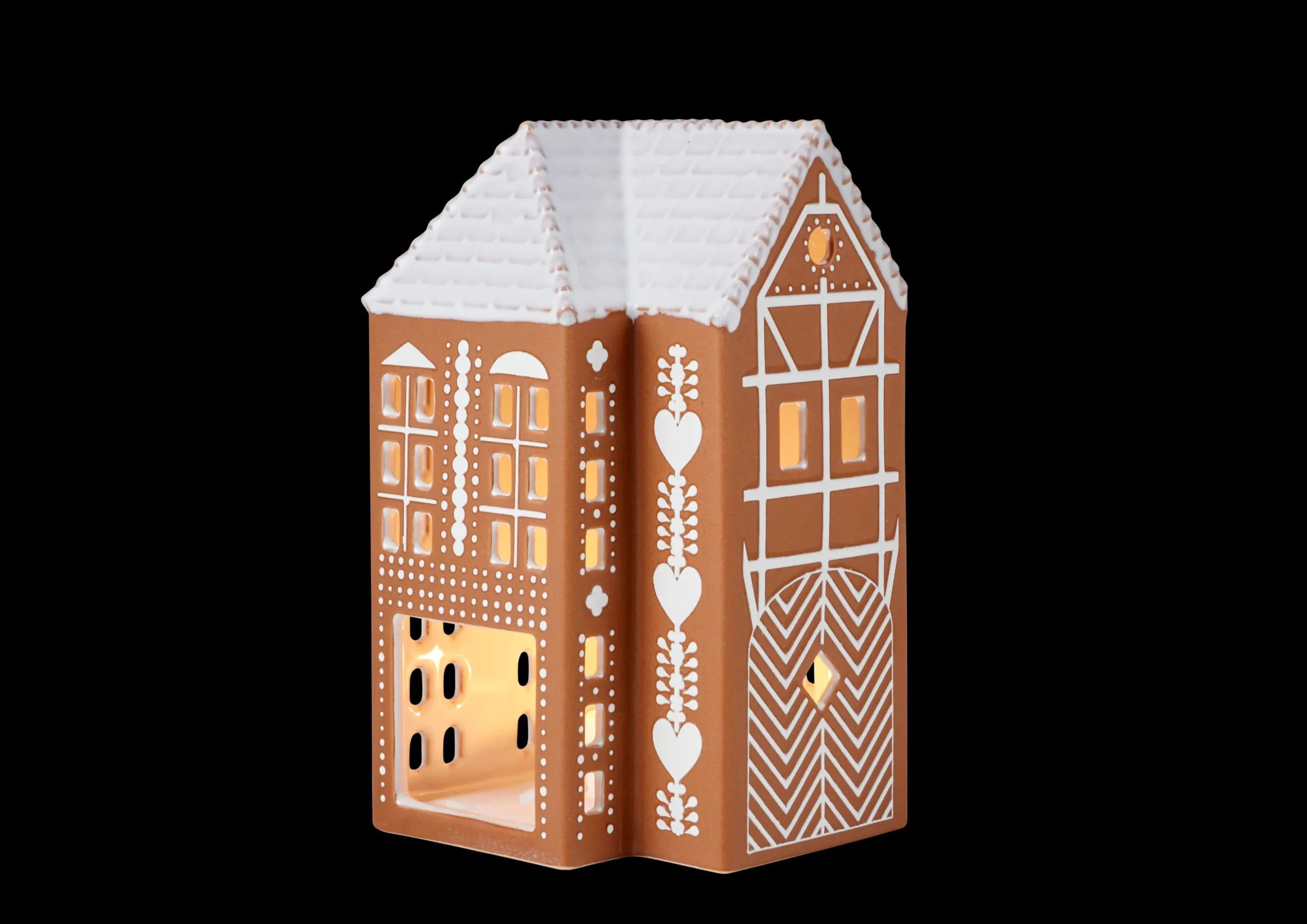Kähler Gingerbread er en serie af håndlavede honningkagehuse, hvor Kählers keramiske ophav og den danske jul er sat på en fælles designformel. Dette honningkagehus emmer af jul, charme og traditioner og er med sine 17 cm i højden det største af honningkagehusene. Husets forside er belagt med et fint bindingsværkmønster, et cirkelformet og smukt dekoreret vindue og en stor port, der inviterer indenfor til masser af autentisk varme og hygge. Siderne på lyshuset er pyntet med store, hvide hjerter som symbol på den kærlighed, der ligger i hjerternes fest – julen. Skab et hyggeligt julelandskab med nisser omkring husene eller brug dem alene som håndlavede designelementer, der med deres blanke og taktile glasur og den rå, uglaserede keramik vil stå smukt og sprede hygge. Gingerbread-lyshusene har en brun, mat yderside, der minder om honningkagedejen og er pyntet med hvide, blanke dekorationer og hvide tage, der ligner glasur. Og som en vigtig detalje er honningkagehusene hvidglaseret indvendigt, så det varme lys fra fyrfadslyset reflekteres og skinner ud. Store som små er de alle udskåret i hånden, og lyset fra husene skaber på denne måde legende klynger af lys og skygge omkring sig, hvor end honningkagehusene placeres.