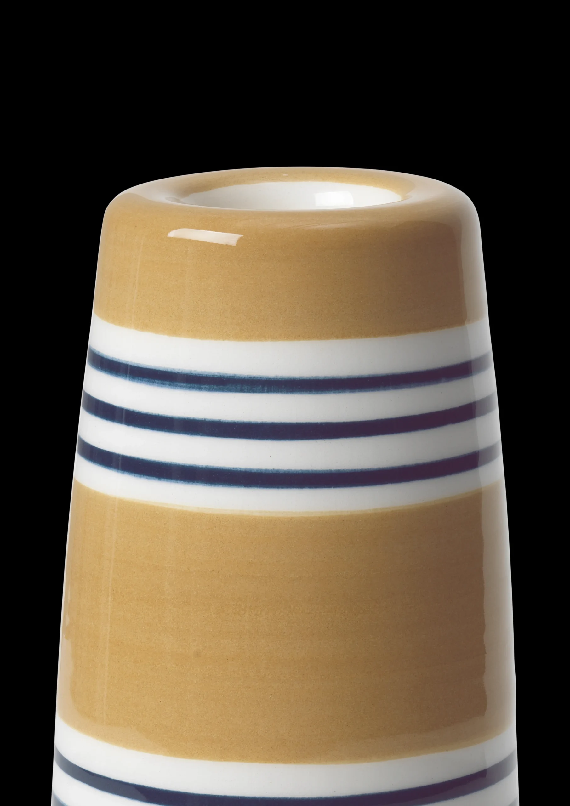 Du har måske allerede inviteret naturen indenfor med en buket blomster eller en potteplante smukt og stilfuldt placeret i en vase eller en urtepotte fra Omaggio Nuovo-serien? Med introduktionen af to Omaggio Nuovo-lysestager i to størrelser og to farvekombinationer giver Kähler dig nu endnu flere muligheder for at kombinere kærligheden til keramik med kærligheden til blomster, planter og levende lys. Den store lysestage kommer i okker og måler 16 cm, mens den lidt mindre på 12 cm har en mørkeblå bundfarve og smalle, lyseblå striber. Begge står smukt med dybde og liv i de håndmalede striber og glasurer, så de får de ’striber i striben’, der kendetegner Omaggio Nuovo og trækker tråde tilbage til Kählers stolte håndværkstraditioner.