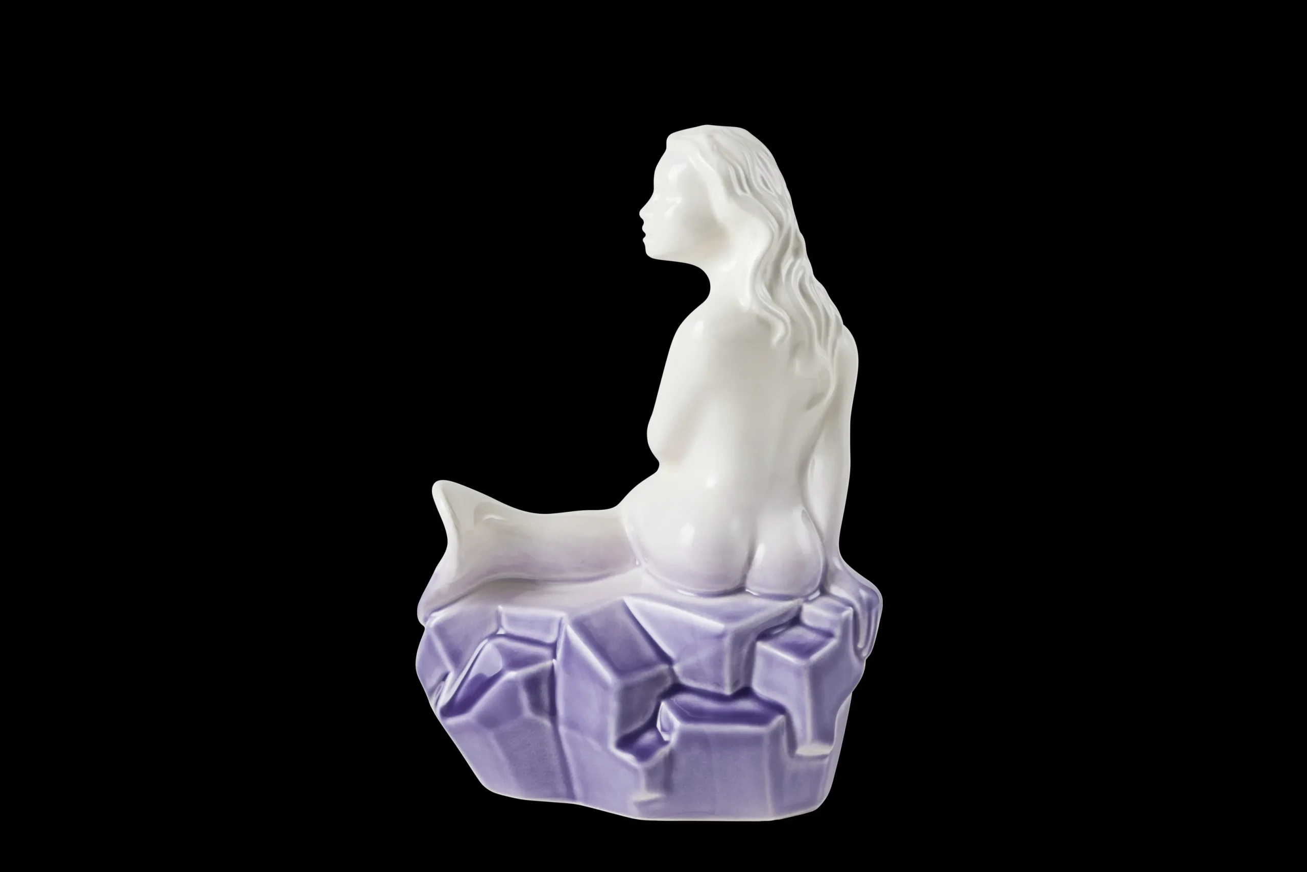 Improved and impatient. Forbedret og utålmodig. Med udgangspunkt i H.C. Andersens verdensberømte eventyr om Den Lille Havfrue har kunstner Louise Hindsgavl med sin vanlige pirrende og provokerende keramiske kunst endnu engang i samarbejde med Kähler skabt en figurativ kickstarter til livets ofte lidt svære snakke. The Ambitious hedder hendes nye figurer i glaseret keramik. Her fortæller hun historien om en havfrue, der prøver nye veje for at gøre sine drømme til virkelighed. Som den foretagsomme og initiativrige unge kvinde hun er, har hun forsøgt sig med ben i stedet for hale. Og hun er klar til at tage et skridt videre. Måske skal der et ekstra bryst til for at charmere prinsen? Den utålmodighed, som havfruen efterhånden må føle i sine bestræbelser på at få prinsen i nettet, har Louise Hindsgavl i sin fænomenale formgivning subtilt udtrykt med den svirpende bevægelse i halen. The Ambitious-figurerne er 20 cm høje og fås i grå, blå og denne lilla variant. Alle emmer af Kählers autenticitet og håndlavede designtraditioner, samtidig med at de med deres udfordrende udtryksform lægger op til samtalen om det, Louise Hindsgavl kalder ’de ting, vi skylder hinanden at tale om, men ofte ikke selv tør tage hul på’. Med The Ambitious tager hun os med ind i en utålmodighedens og mulighedernes verden og stiller sit figurative arbejde til skue – og debat. Hun påtager sig som kunstner ansvaret, påtager sig risikoen ved at starte den svære samtale. For ud over at skabe moderne kunst og design til boligen, så vil Louise Hindsgavl med The Ambitious-figurerne gerne kradse i overfladen på vores kultur og skabe platformen for en diskussion. For eksempel om hvad der ligger i vores stræbsomhed, og hvor langt vi vil gå for at indfri vores ambitioner. The Ambitious bliver kun solgt på Holmegaard værket og på Rosendahl.com. Der bliver kun produceret 200 stk. af hver farve, og de er alle nummererede. Vi kan ikke oplyse om hvilket nummer din figur har/får.