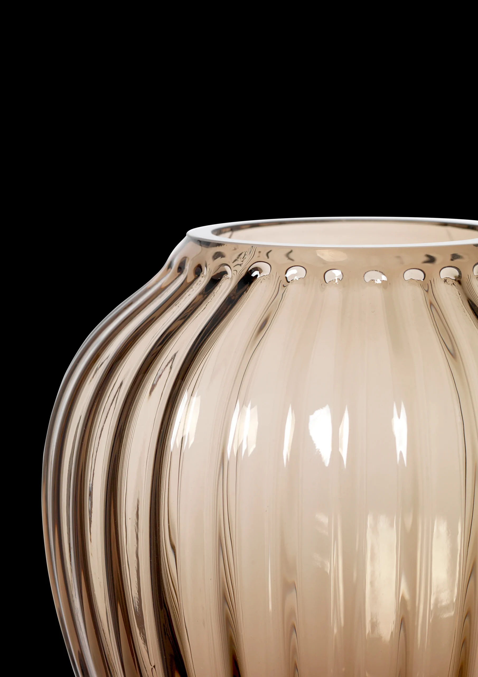 Kähler Hammershøi seriens glasvaser har de karakteristiske profileringer og tydelige riller som kendes fra Hammershøi keramikvaser. Glasvasen har sin egen smukke silhuette og en formmæssig lethed, samtidig med af at vasen har tyngde og stabilitet. Den lanceres nu i en smuk varm valnød farve, hvor dybden i den brune farve smukt harmonerer med de andre Hammershøi serier. Glasvasen er mundblæst i størrelse H 14 cm. Tilfør din borddækning en eksklusiv og kreativ udtryk med de elegante vaser fra Hammershøi. Kombiner glasvaserne med Hammershøi-stellet i porcelæn og tilfør nye spændende dimensioner til din borddækning. Design af Hans-Christian Bauer.