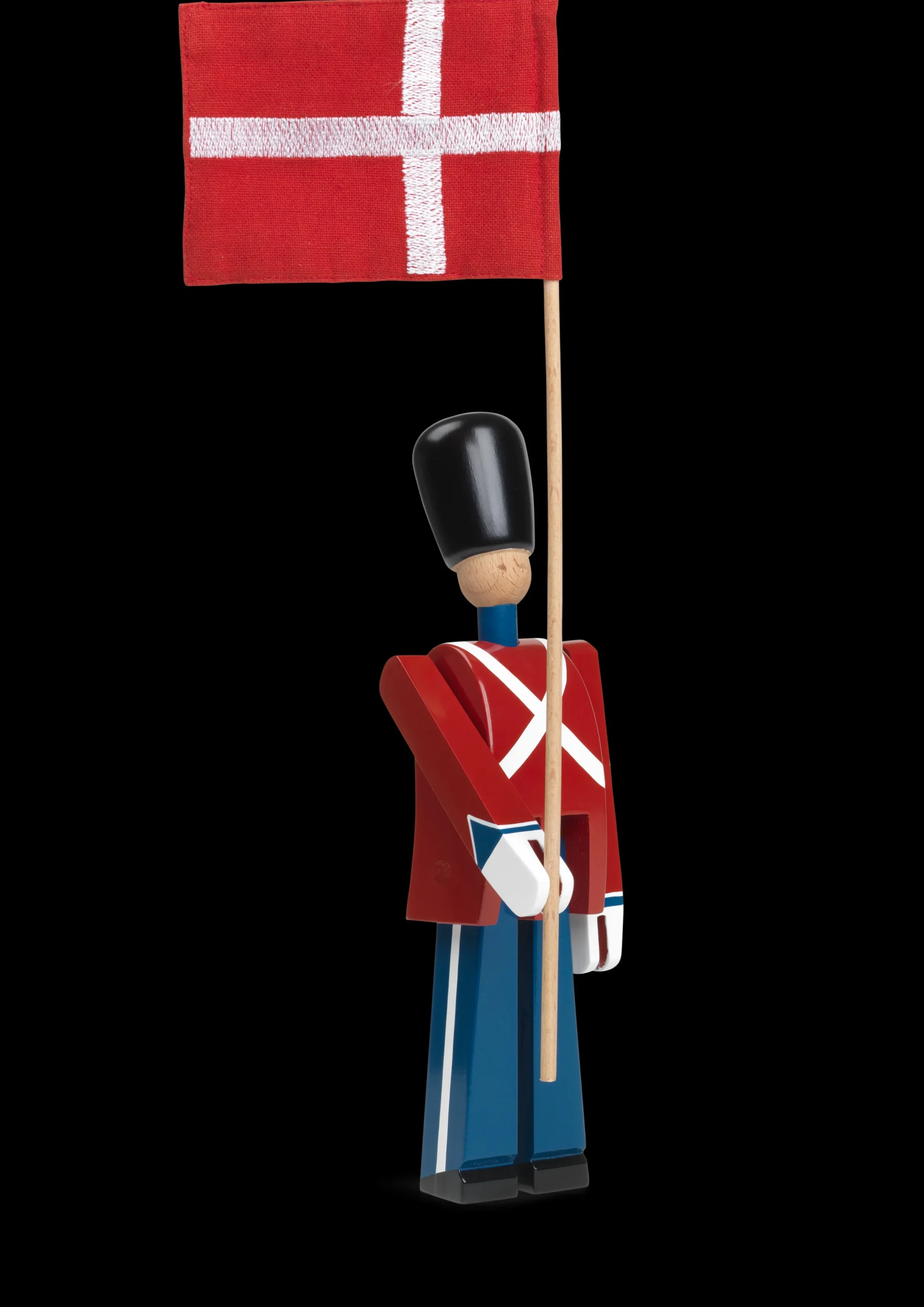 Oplev den lille Fanebærer i rød, blå og hvid fra Kay Bojesen. Her får du den i en mindre størrelse og et flot tekstilflag i bomuld i stedet for papir. Denne ændring gør, at du får en mere robust og holdbar Fanebærer. Samtidig er træet blevet mere bæredygtigt, da den flotte garder er i malet FSC-certificeret bøgetræ. Inspireret af et af Danmarks nationalsymboler fra Amalienborg Slotsplads er Fanebæreren ofte en fast gæst på morgenbordet til fødselsdage. Samtidig er den stolte og ranke træfigur et symbol på dansk design. Med den lille Fanebærer kan du dermed fejre fødselaren med manér. Fuldend samlingen sammen med resten af Kay Bojesens gardere, og få et overdådig fødselsdagsbord. Kay Bojesen har blandt andet designet gardere med en tromme og et gevær. Derudover kan du få træfigurerne i forskellige størrelser. Bestil dine favoritter hos Rosendahl, og få dem leveret i en fin Kay Boyesen æske. Vær forsigtig når flaget placeres. Rul forsigtigt flagstangen ind i Fanebærerens hånd ved brug af begge hænder.