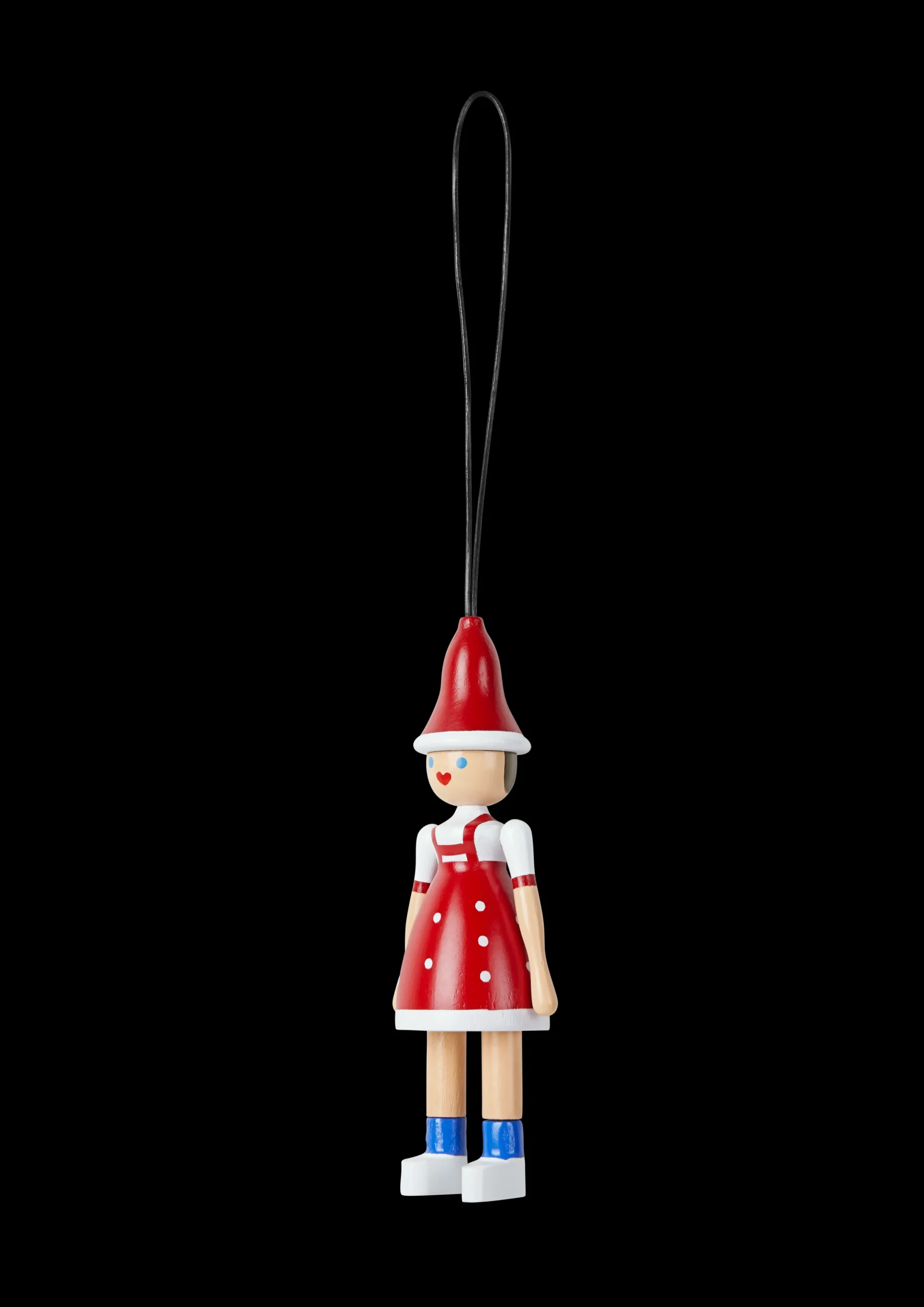 Kay Bojesen skaber året rundt originale fortællinger i træ, og med Jule Lise og Jule Ole som ophæng kan du nu fuldende Kay Bojesen-julefamilien og på smukkeste vis samle hele familien til en jul med originale fortællinger i træ om dengang, der altid var kanekørsel og hvid jul over landet. Nøjagtig ligesom Julemand og Nissemor kommer også Jule Lise og Jule Ole som par og måler ca. 10 cm – samme højde som de ’voksne’ ophæng. Figurerne er fremstillet i FSC®-certificeret bøgetræ og udført med den store præcision og omhyggelighed, der er indbegrebet af Kay Bojesen. Hele familien i denne mindre udgave som julepynt er baseret på Kay Bojesens originale figurer og er indbegrebet af klassisk jul, hvor julestemningen indfinder sig som ved et trylleslag, når der pyntes op med den søde og glade familie. Jule Lise er klædt i en charmerende julekjole med hvide prikker, der nærmest lander på skørtet som snefnug. Hun har blå ankelsokker på, der matcher Jule Oles blå bukser. Han er klædt på til fest med hvid skjorte, rød jakke og butterfly. Begge har de klareste blå øjne. Og de flotte røde, hvide og blå farver komplimenterer det moderne og tidløse udtryk – klar til en uforglemmelig juleaften med hele familien samlet. I år. Næste jul. Og de næste mange år frem.