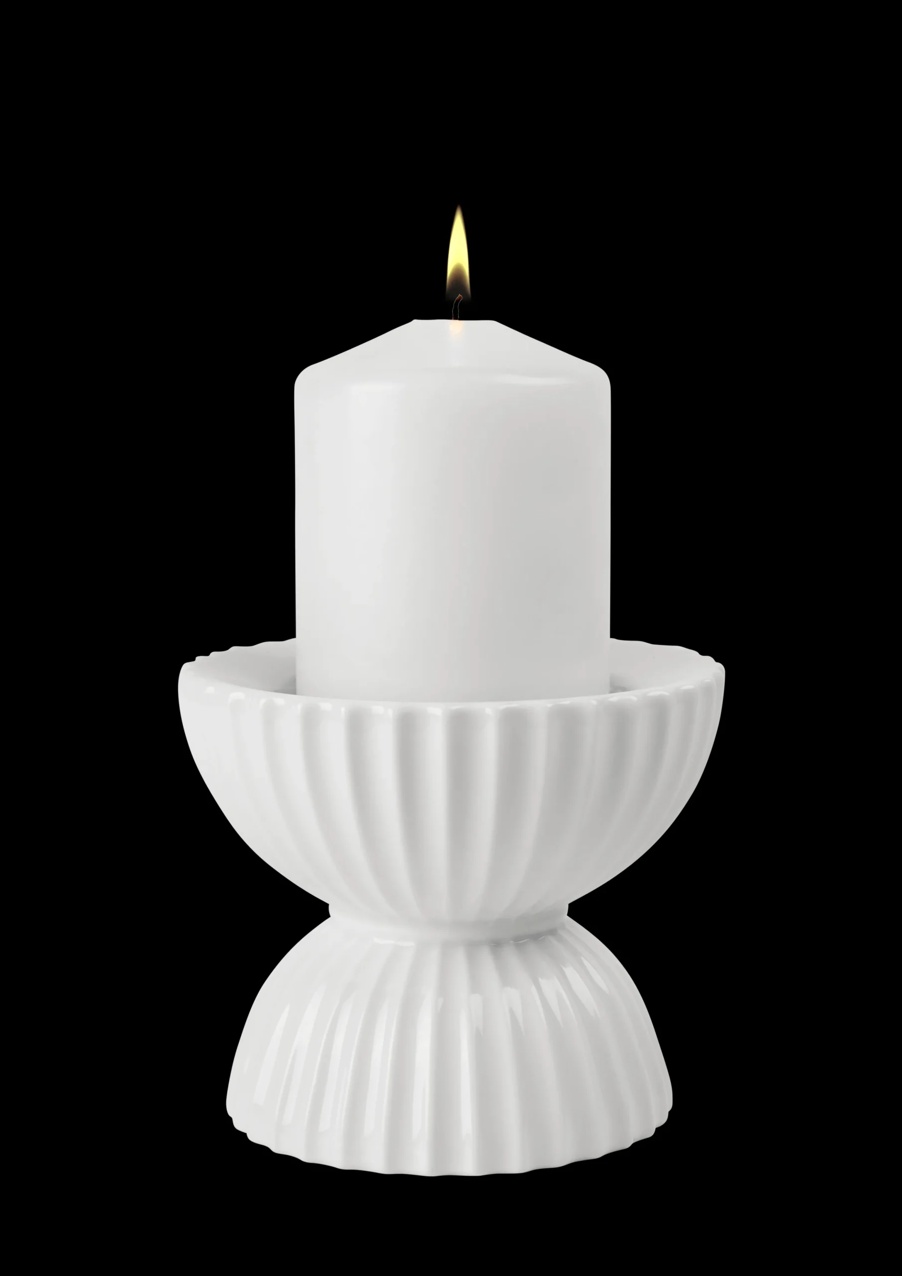Elegante former, kant og masser af attitude. Med denne Tura-lysestage til bloklys får du enkel, stilren og skulpturel brugskunst, som vi kender det fra Lyngby Porcelæn, hvor arkivdesign, klassiske former, mønstre og rendyrket æstetik udfoldes med linjer til perfektion. Lysestagen måler 10 cm i højden og er designet, så den nærmest trækker lyset ned i den øverste halvkugle. De ikoniske Lyngby-rifler følger lysestagens markante former og skaber et moderne udtryk i kontrasten mellem det stringente og det bløde. Og detaljen med halvkuglerne, der møder hinanden i det smalle bånd, giver samtidig lysestagen en lethed, der passer perfekt ind i nutidens interiør, hvor Tura-lysestagen med sit voluminøse formsprog og store personlighed helt naturligt fanger opmærksomheden i rummet og nærmest er en skulptur i sig selv.