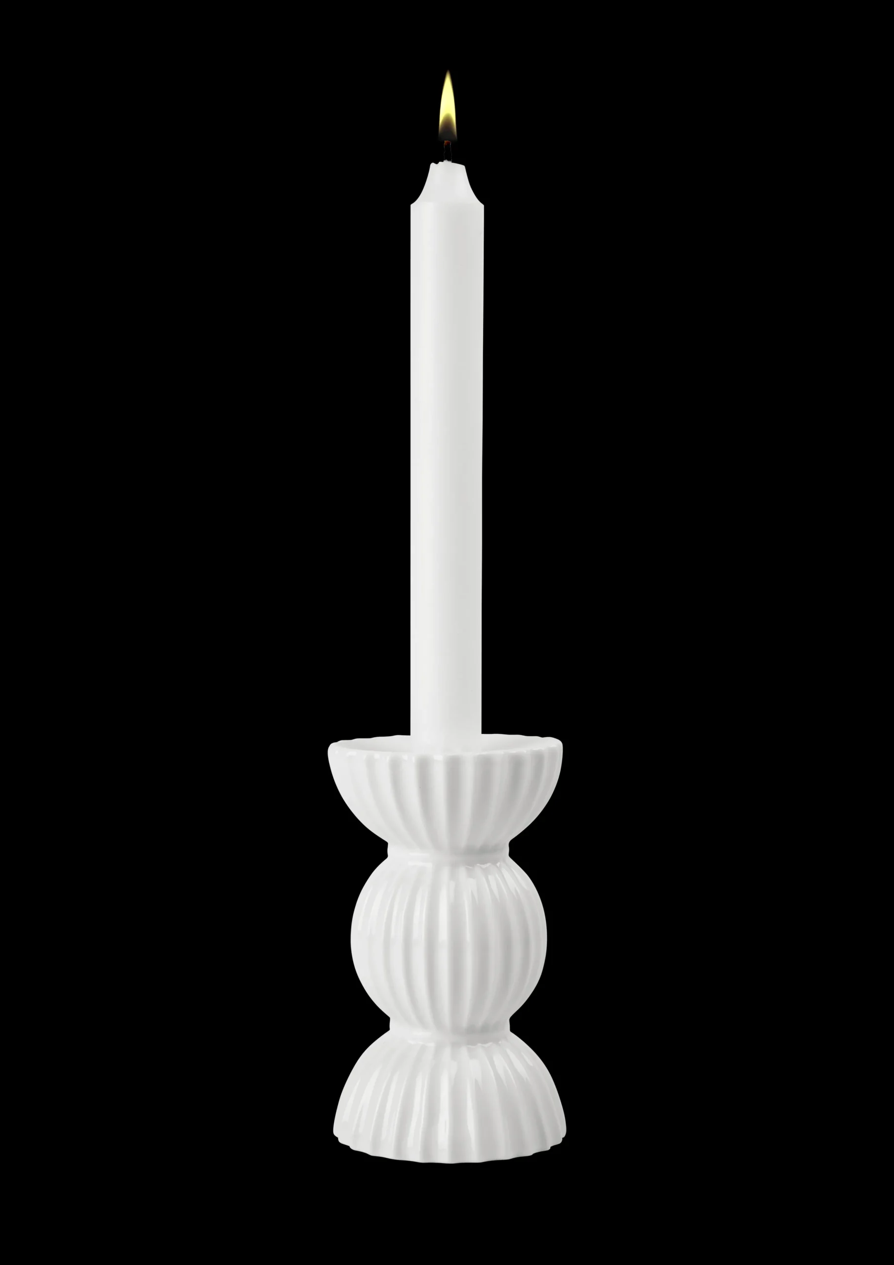 Elegante former, kant og masser af attitude. Med denne Tura-lysestage til kronelys får du enkel, stilren og skulpturel brugskunst, som vi kender det fra Lyngby Porcelæn, hvor arkivdesign, klassiske former, mønstre og rendyrket æstetik udfoldes med linjer til perfektion. Lysestagen måler 14 cm i højden og er designet med to smalle bånd, der løfter lysestagen og giver den en kuglerund midte. De ikoniske Lyngby-rifler følger lysestagens markante former og skaber et moderne udtryk i kontrasten mellem det stringente og det bløde. Og detaljerne med kugleformerne, der møder hinanden i de smalle bånd, giver samtidig lysestagen en lethed, der passer perfekt ind i nutidens interiør, hvor Tura-lysestagen med sit voluminøse formsprog og store personlighed helt naturligt fanger opmærksomheden i rummet og nærmest er en skulptur i sig selv.