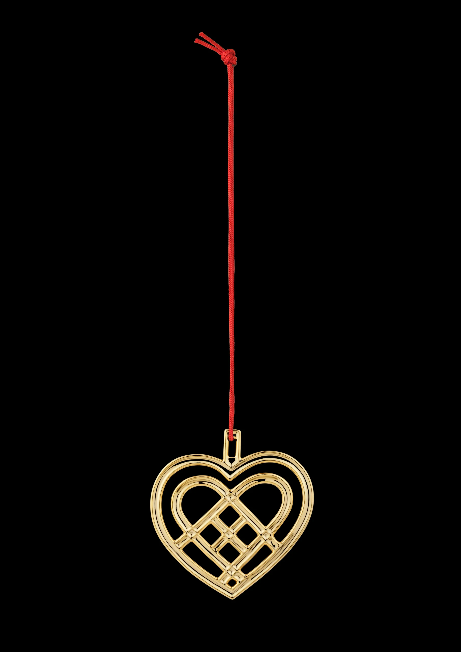 Klassisk julepynt med kunstnerisk kant. Rosendahls Karen Blixens Jul er for mange indbegrebet af den hyggelige og traditionelle jul – fuld af historie og julesymbolik, der får juleglæden til at holde helt indtil juleaften. Ole Kortzau lavede sin første Karen Blixen-julepynt tilbage i 2007. Og hvert år kommer der nye ophæng til i den særlige håndlavede kvalitet skabt med omhyggelighed og øje for detaljen i en sådan grad, at hvert enkelt ophæng fremstår som et lille kunstværk i sig selv, belagt med ægte sølv og guld. 2024-kollektionen rummer blandt andet dette forgyldte ’flettede julehjerte’, der smelter sammen med og omkranses af et større hjerte – et symbol på kærlighed og samvær i juletiden. Ligesom de andre små ophæng i serien er det ca. 7 cm i højden og fungerer perfekt som vinduespynt. Motiverne i Karen Blixens Jul er ofte en kærlighedserklæring til børnenes perspektiv på julen. Men selvom Ole Kortzaus julehistorier tager udgangspunkt i virkeligheden, så er de ikke virkeligheden. Derfor er der også altid lige puffet lidt til motiverne. De er altid lidt skæve, lidt underfundige. Ole Kortzau vil have os til stoppe op, tage en pause – og opdage alle de klassiske karakterer på en anden måde. Det trænede øje vil da også lægge mærke til, at de to hjerter i dobbelthjertet med designerens egne ord er ’fuldstændig vinde og skæve’.nDette juleophæng leveres med en fin rød snor.