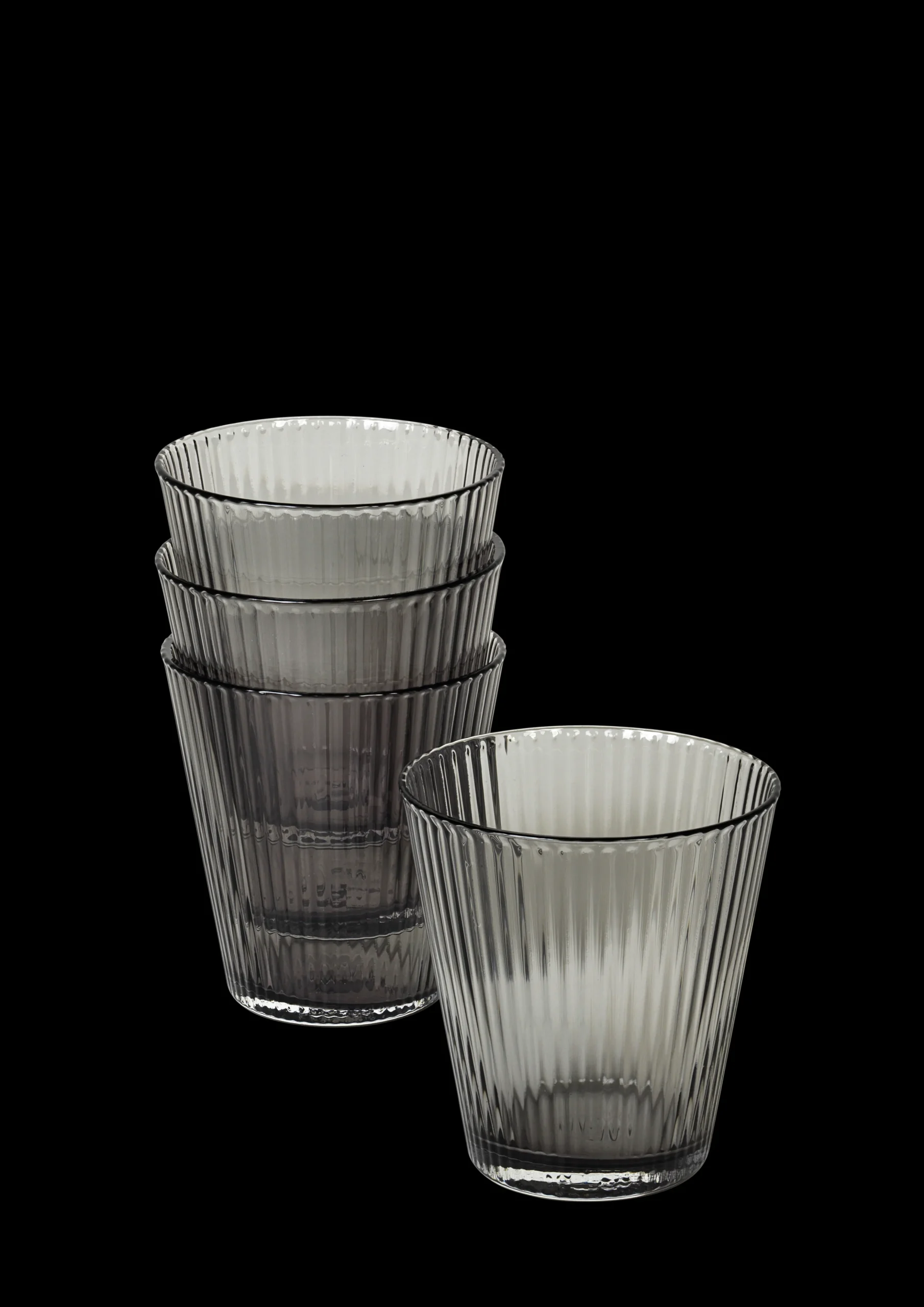 Elegante og funktionelle glas til hverdagsbrug, servér iskoldt forfriskende vand i de elegante røgfarvede glas. Gentagende riller pryder overfladen i glasset og skaber et raffineret optisk spil, når lyset brydes. Et elegant eksempel på funktionelle, stabelbare glas til det moderne liv. Glasset rummer 26 cl og tåler opvaskemaskine op til 55 grader.