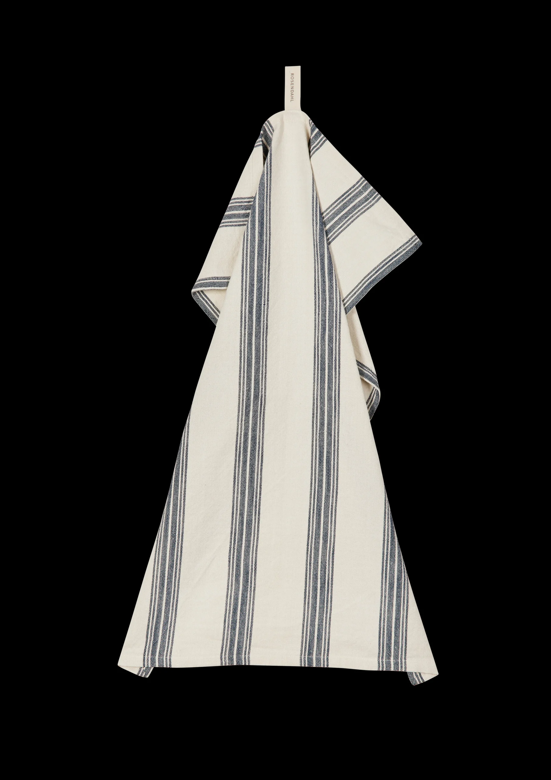Få funktionalitet og farver ind i køkkenet med viskestykker i Rosendahl Textiles-serien. Mønstrene er variationer over klassiske køkkentekstiler, men med et moderne udtryk i kraft af farvevalget og den minimalistiske brug af tern og striber. Viskestykkerne har en både flot og funktionel vævning, hvor tråden twister og skaber den såkaldte cotton-slub-struktur, som giver et råt og rustikt udtryk og et viskestykke, der absorberer godt og tørrer hurtigt. Dette viskestykke måler 50×70 cm og er vævet med striber i varierende bredde, der samler sig som to baner i viskestykkets længde i sæsonens mørkeblå farvenuance. Striberne står i smuk kontrast til grundfarven i sand, der bidrager til et roligt og jordnært udtryk. Viskestykket er fremstillet i et mix af genanvendt GRS-certificeret bomuld og genanvendt GRS-certificeret polyester, der garanterer en social og miljømæssig forsvarlig produktion. Rosendahl anbefaler at vaske viskestykkerne ved 40 grader for at spare på strømmen og skåne miljøet, men de kan sagtens tåle at blive vasket ved 60 grader, uden det går ud over kvaliteten. (GRS Certified by Control Union, CU1026087)